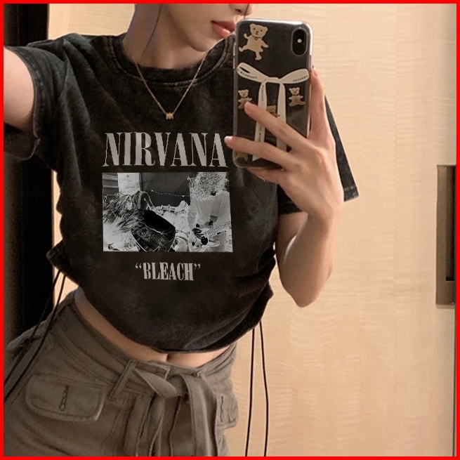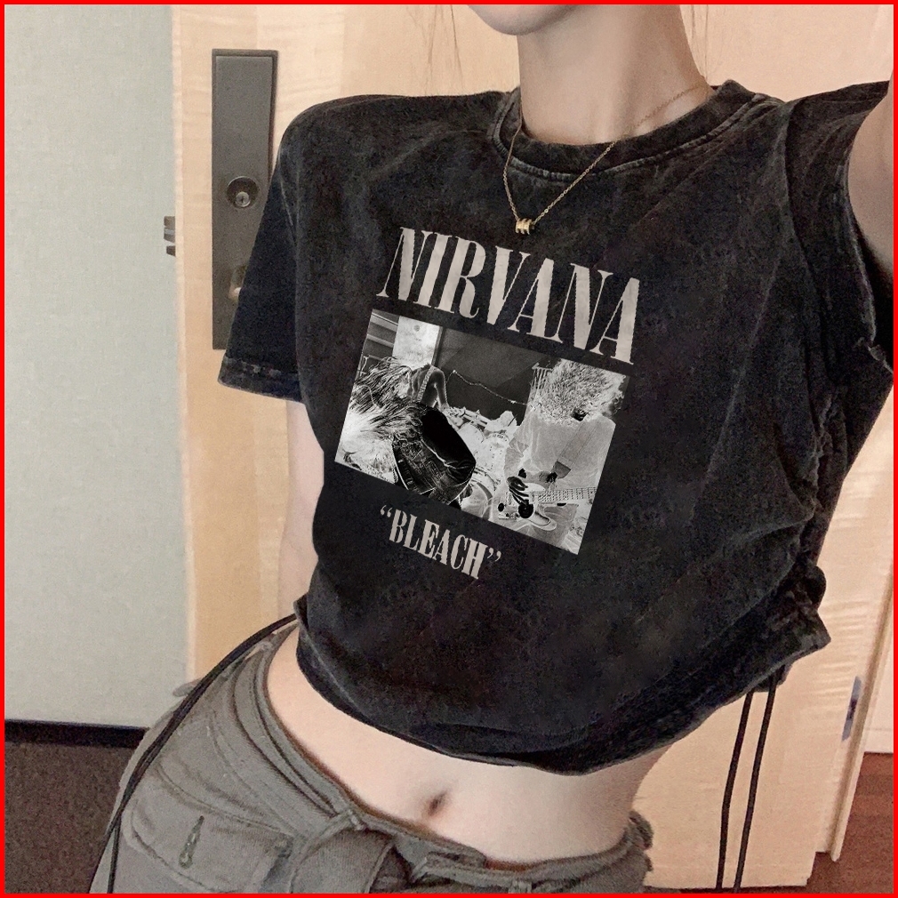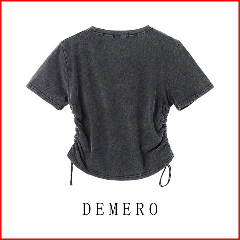 Demero Kaos Crop Wanita Korea Kaos Retro High Street Pattern Lengan Pendek Baju Atasan Wanita Terbar Crop Top Serut Wash