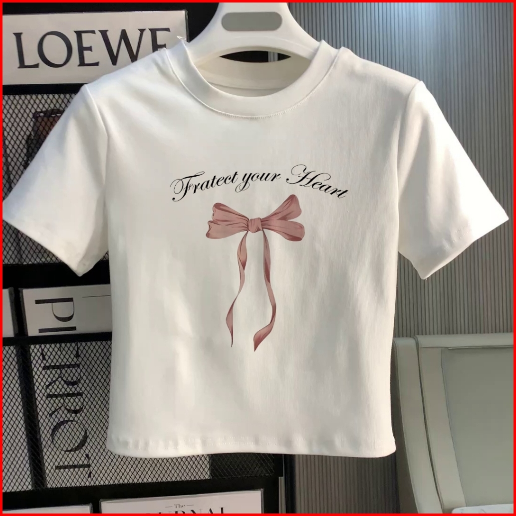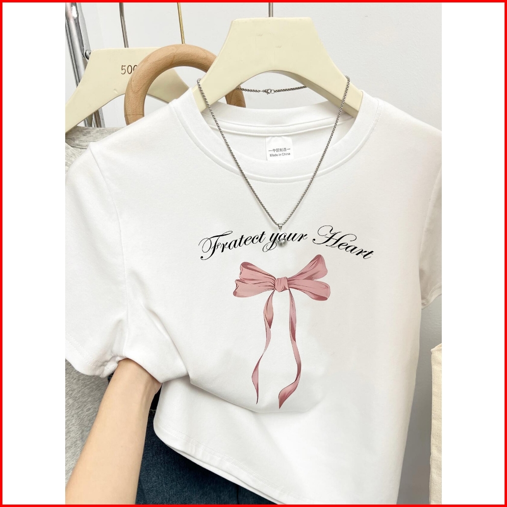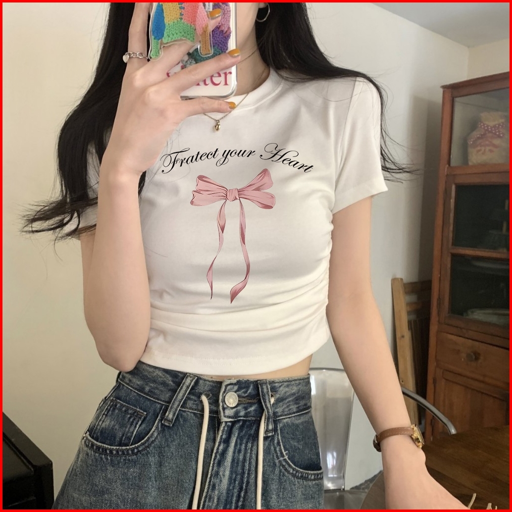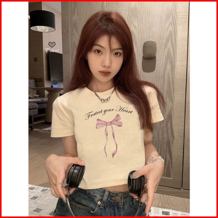 Yiyoyi Kaos Crop Wanita Slimfit Pink Bow Baju Croptee Cream Korea