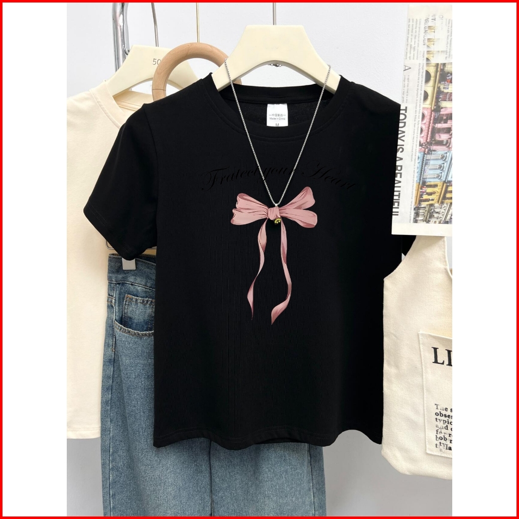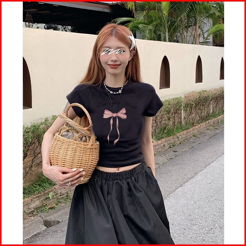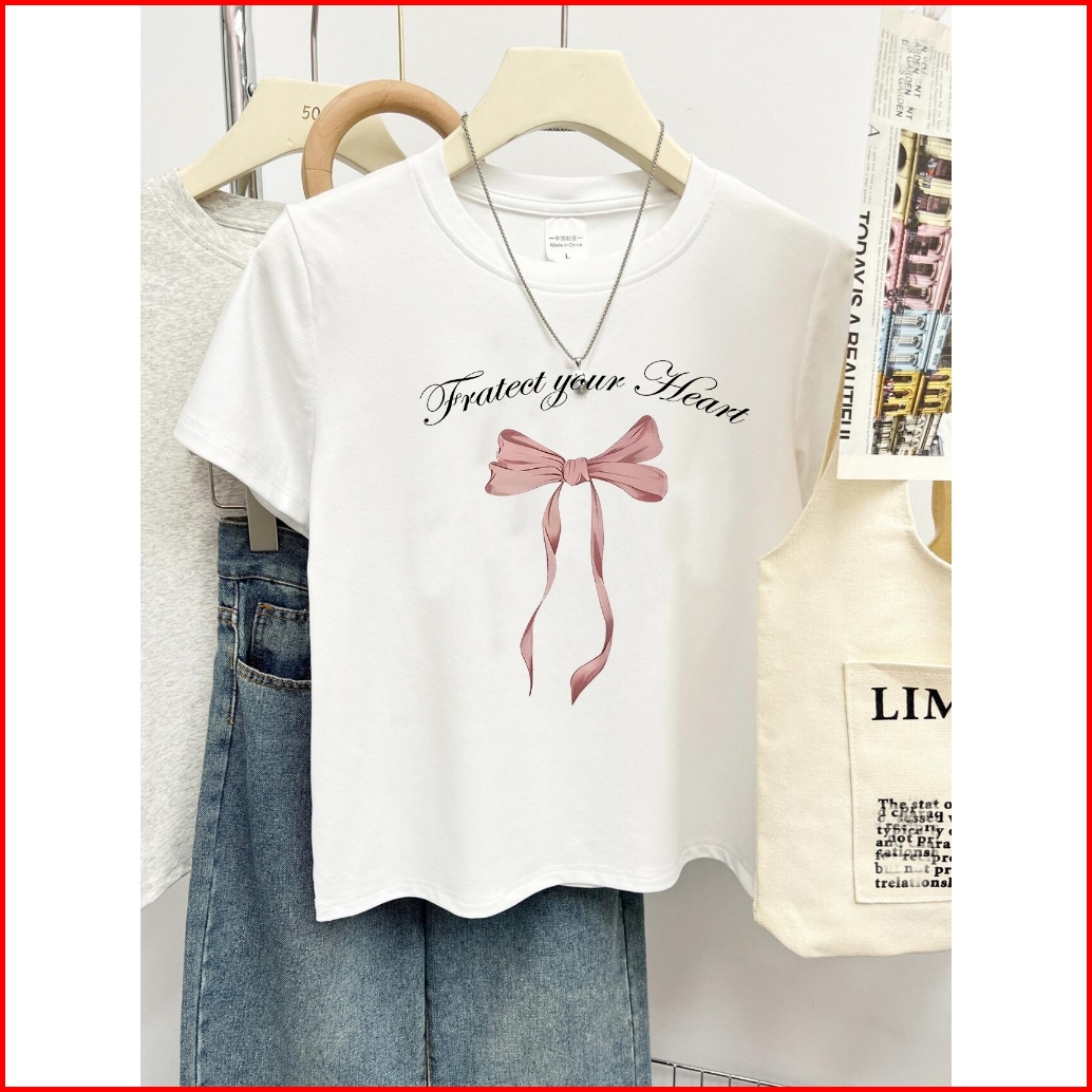 Yiyoyi Kaos Crop Wanita Slimfit Pink Bow Baju Croptee Cream Korea
