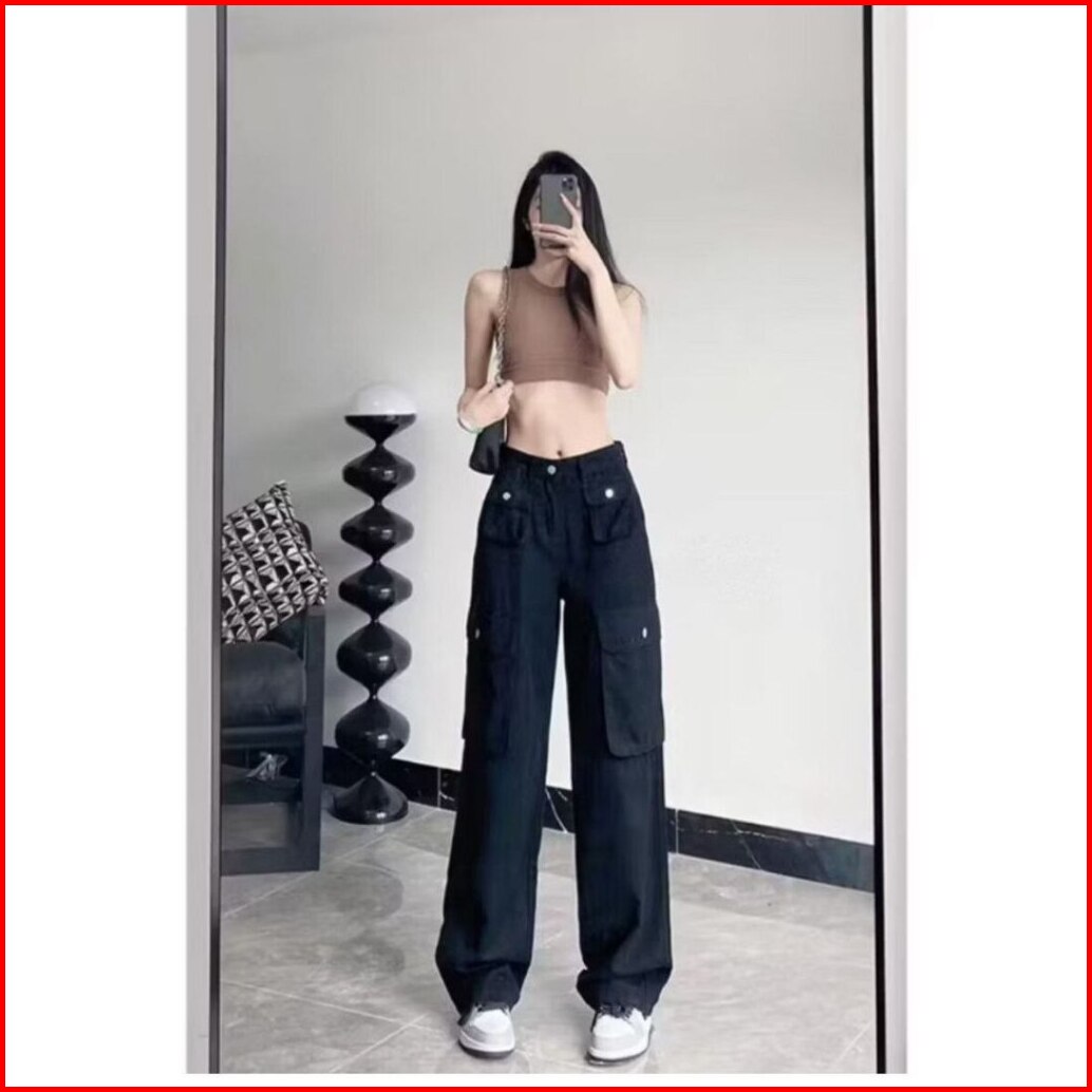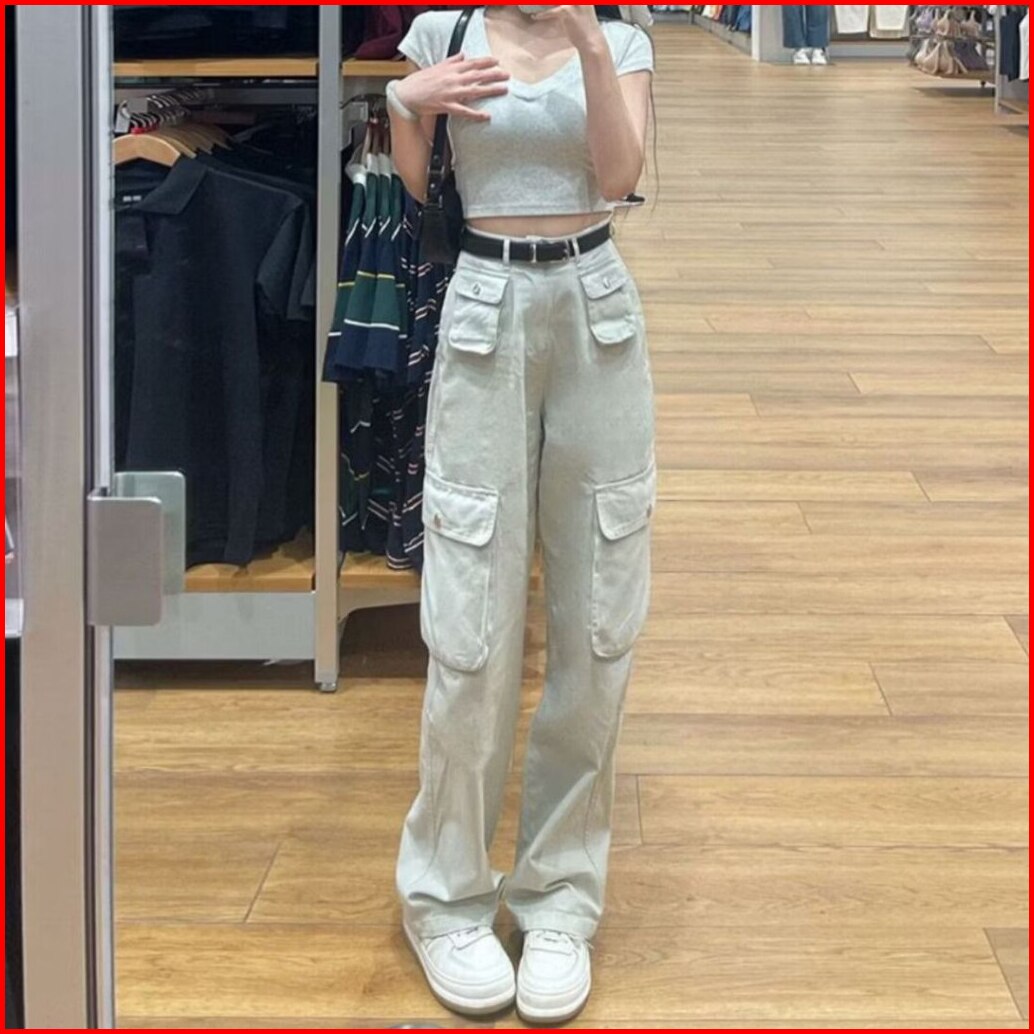 Kargo Denim Pasir Putih Celana Highwaist Loose Jeans Wanita Celana Panjang Wanita