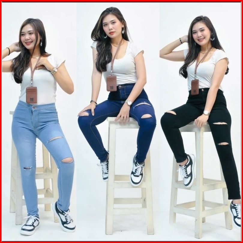 Celana Jeans Hw Panjang Wanita Sobek Bahan Melar Korean Style Remaja Dewasa Kekinian Murah