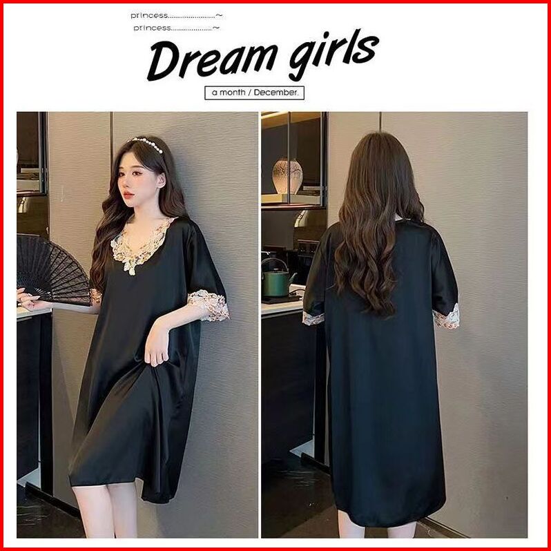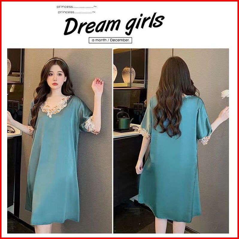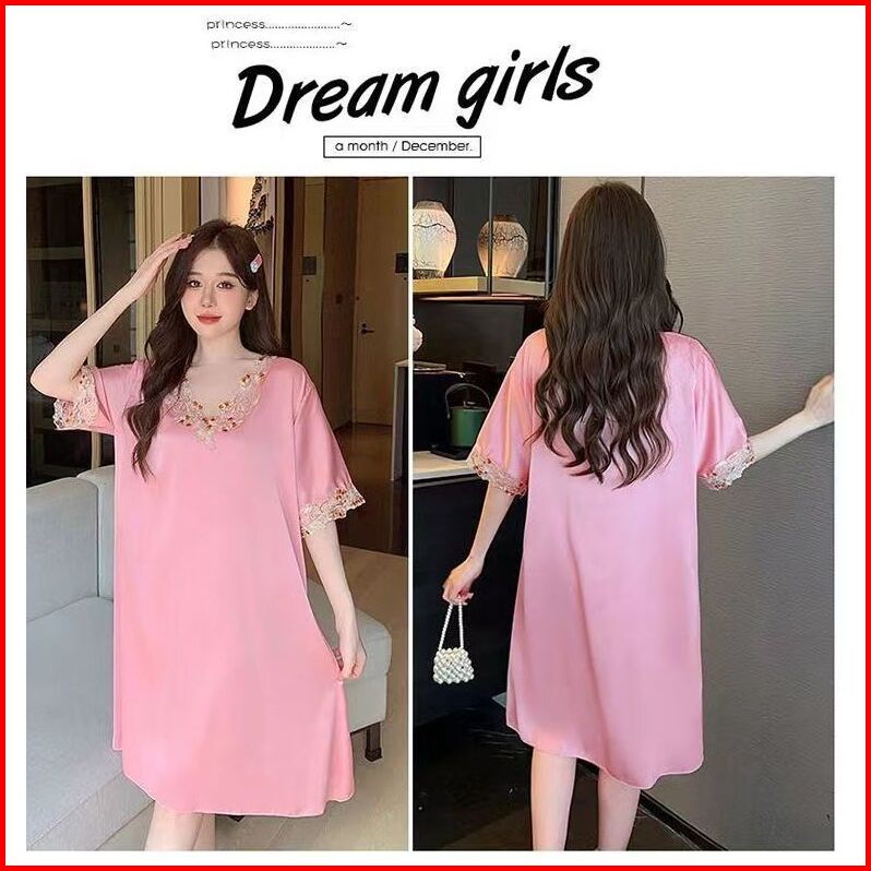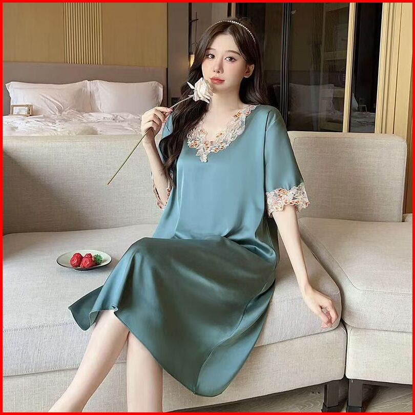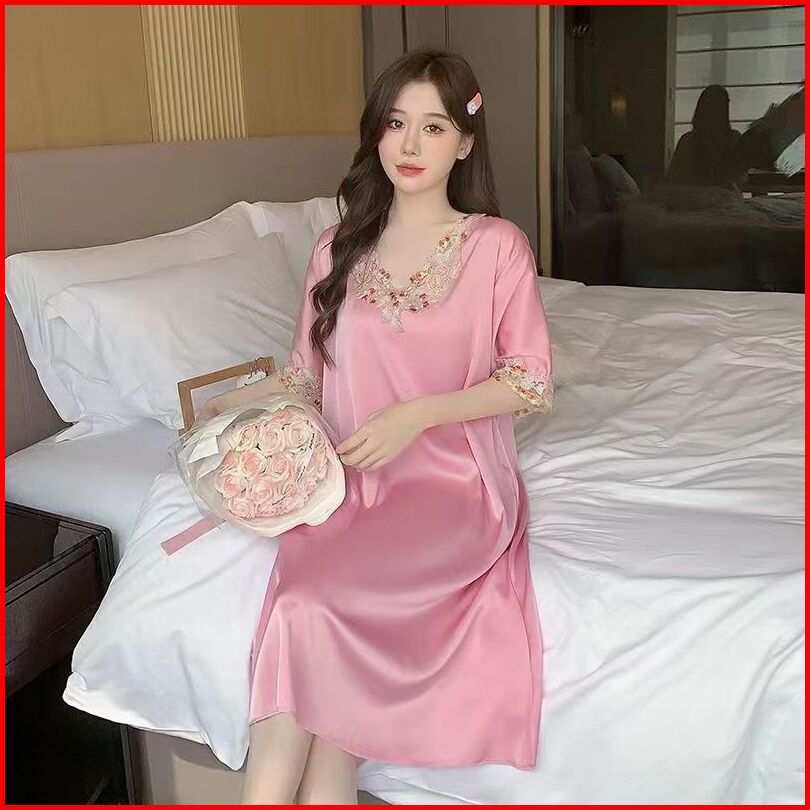 Gaun Tidur Premium Wanita - Katun Es Lembut Desain Kerah Bordir Mewah Piyama Sutra Es Wanita Baju Tidur Daster Baju Tidu