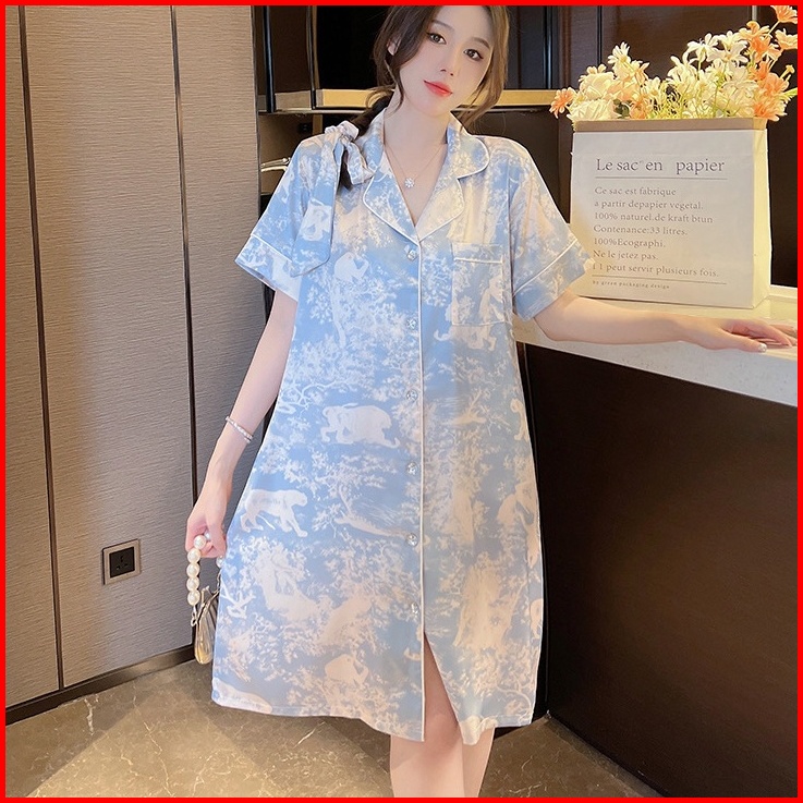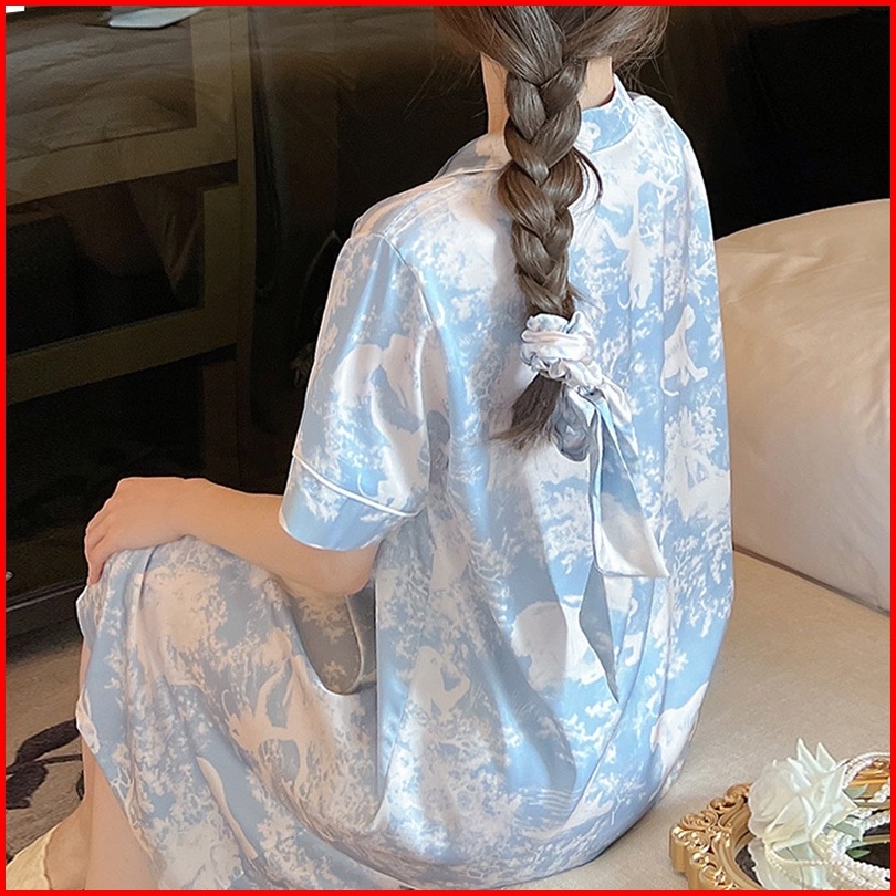 2025 Baju Tidur Sutra Es Tie-dye Baju Tidur Wanita Panjang Kemeja Sutra Berkualitas Tinggi