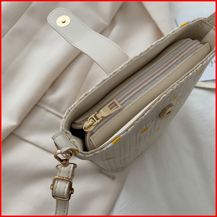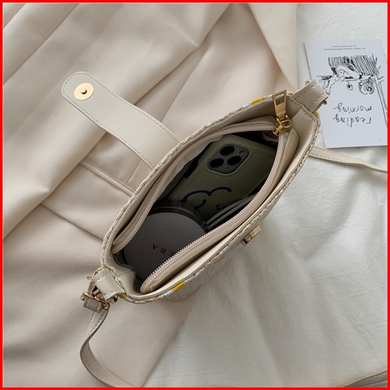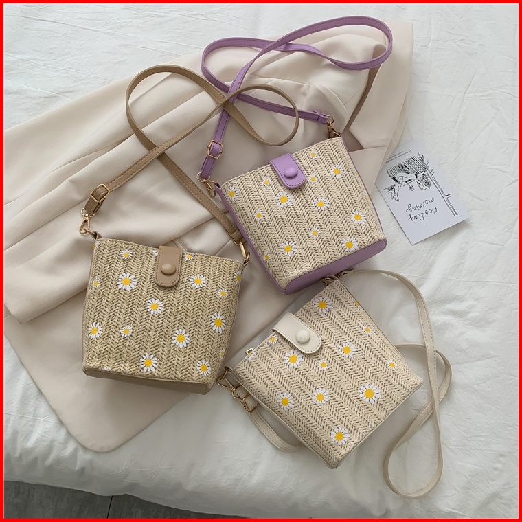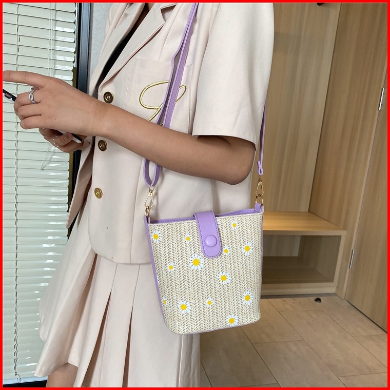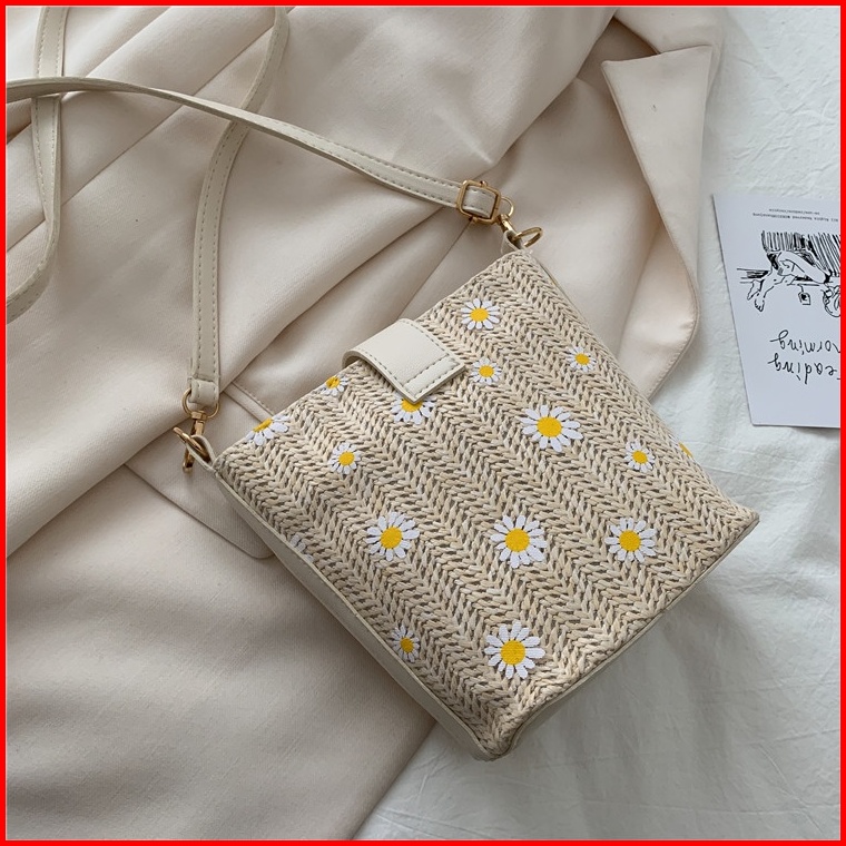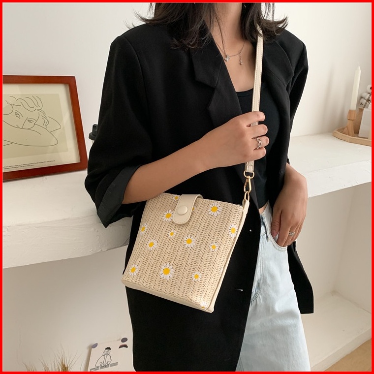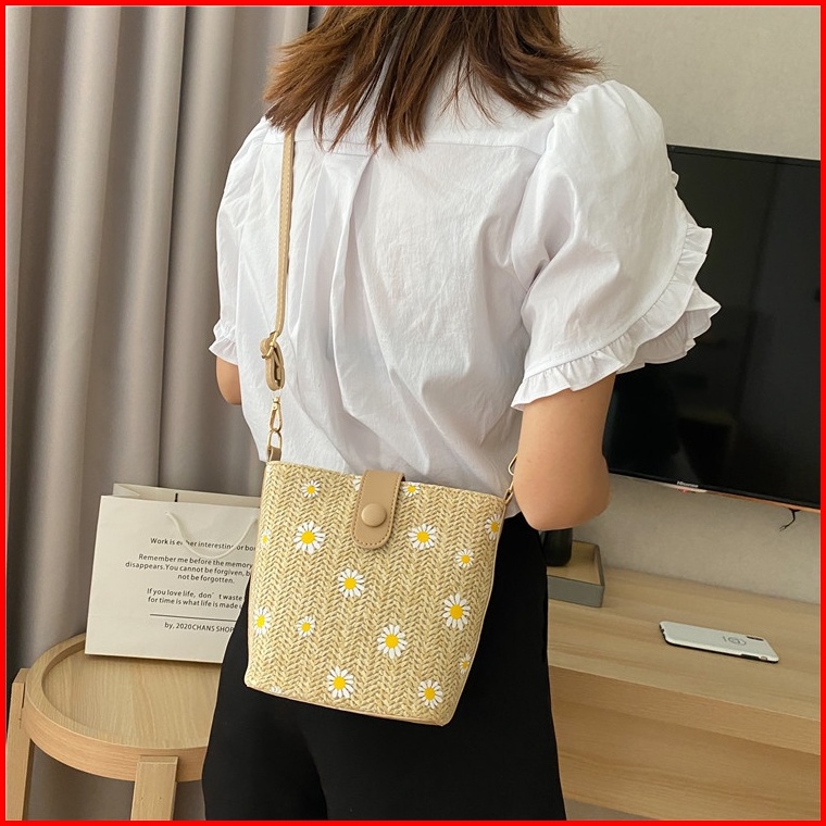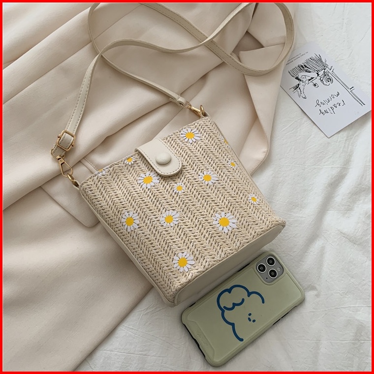Tas Selempang Wanita Korea Bucket Kancing Bahan Anyaman Jerami Motif Daisy Sling Bag Import