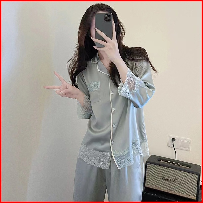 2023 Renda Baru Perancis Es Sutra Sutra Lengan Panjang Piyama Wanita Pakaian Rumah Pakaian Set