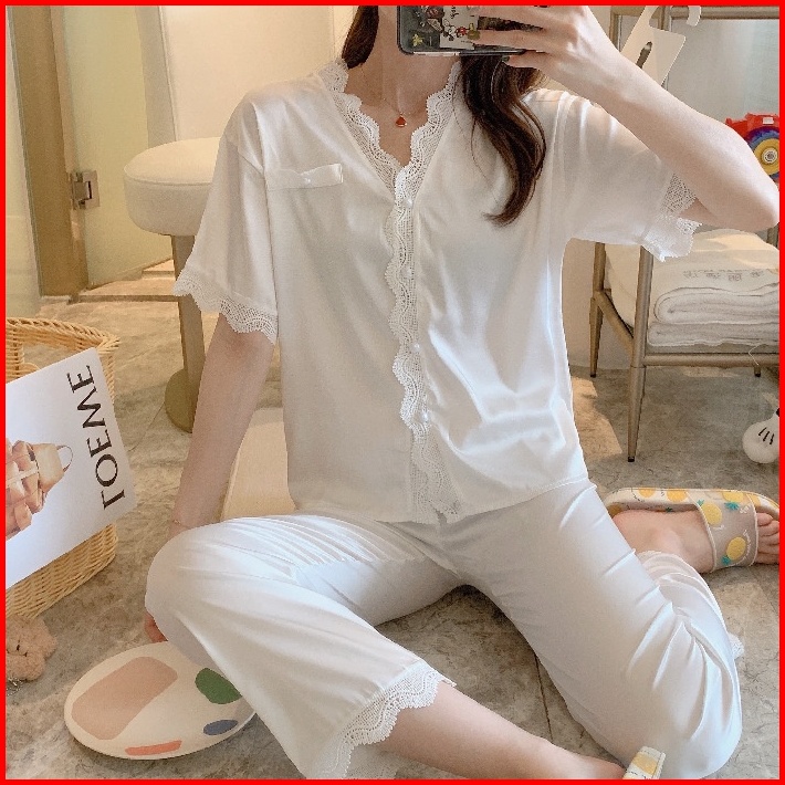 2025 Piyama Wanita Baru Sutra Es Sutra Warna Solid Renda Korea Pakaian Rumah