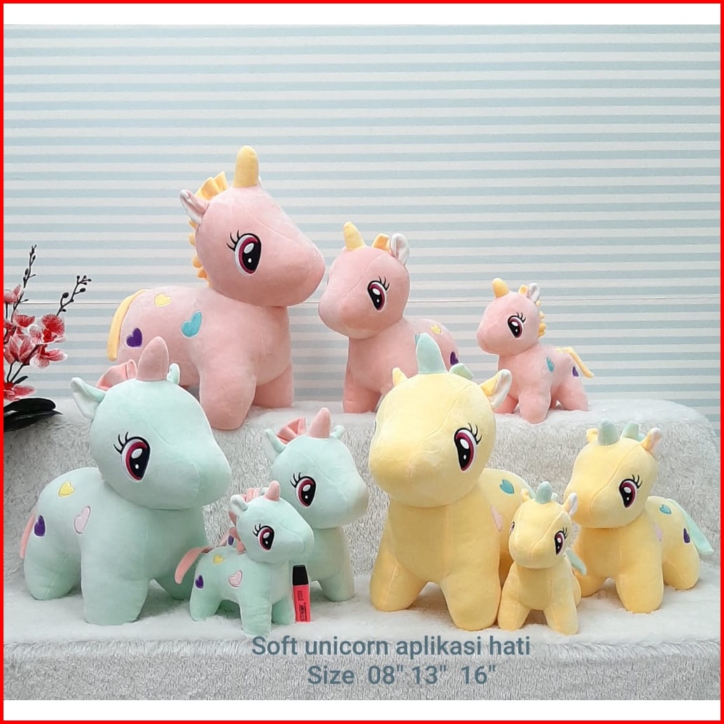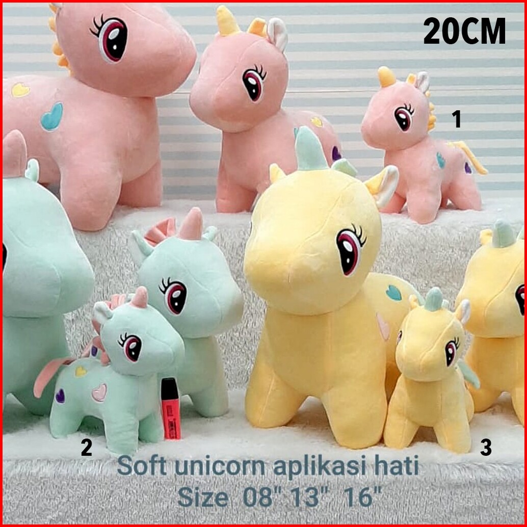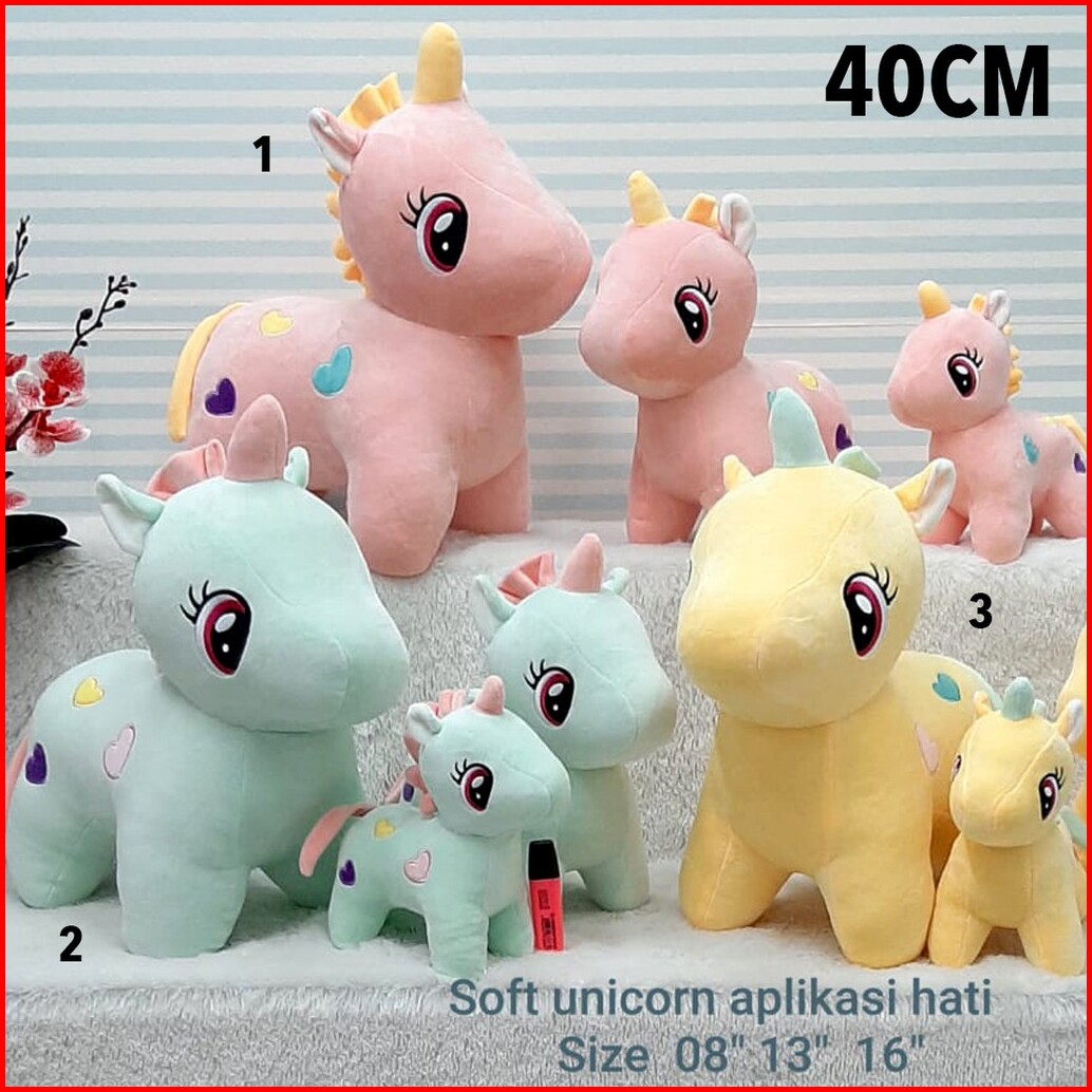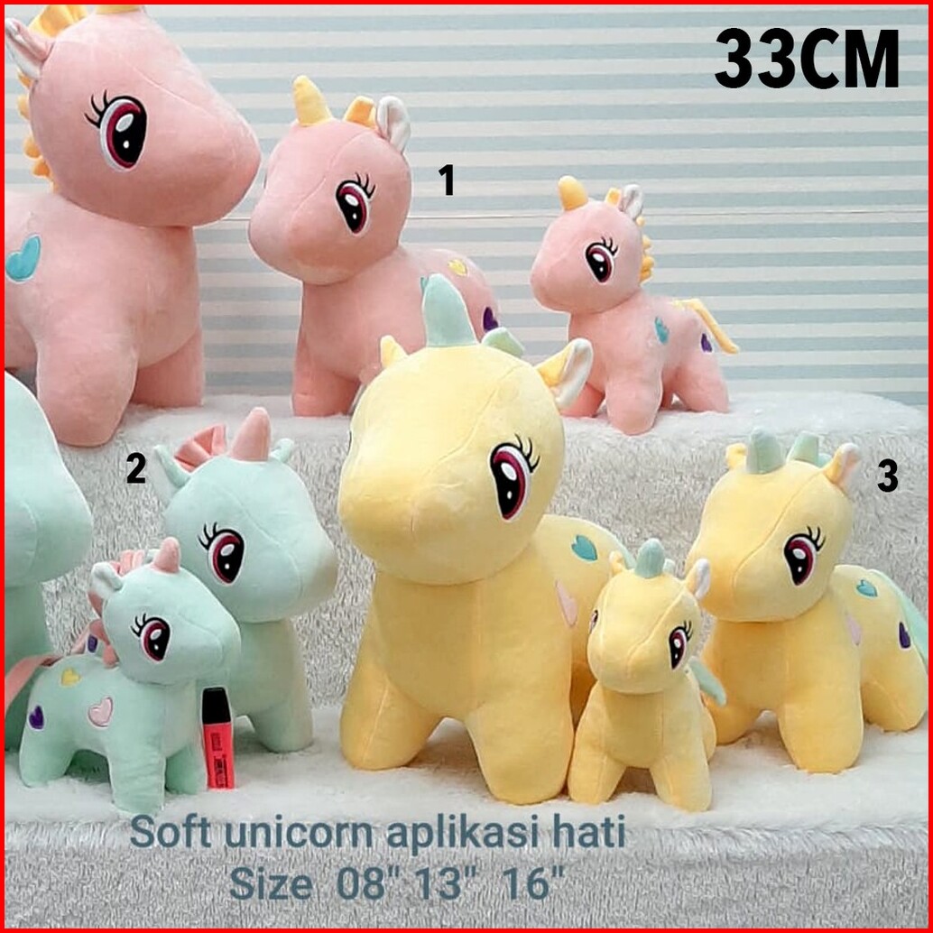 Unicorn Pink 20CM, Unicorn Kuning 20CM, Unicorn Hijau 20CM, Unicorn Pink 33CM, Unicorn Kuning 33CM, Unicorn Hijau 33cm, Unicorn pink 40CM, Unicorn Kuning 40CM, Unicorn Hijau 40CM