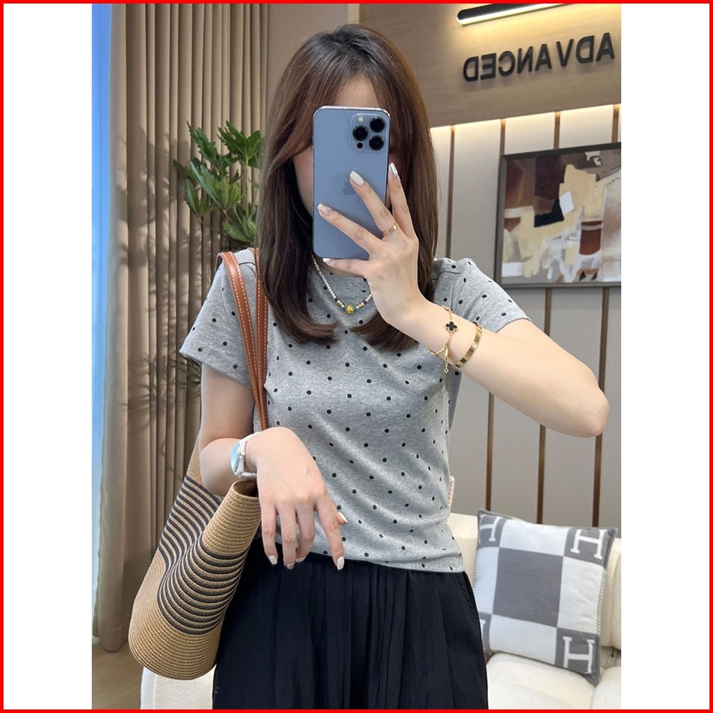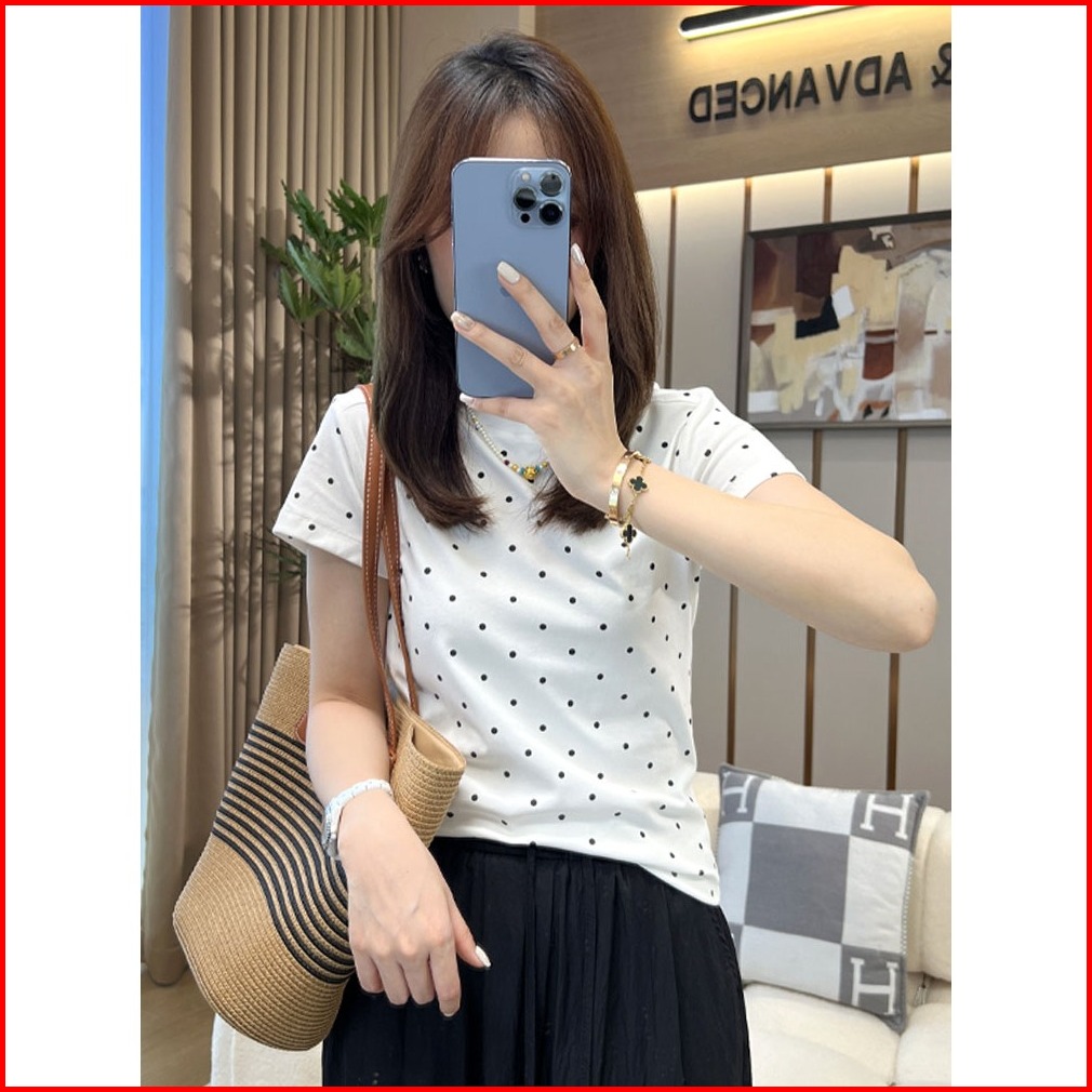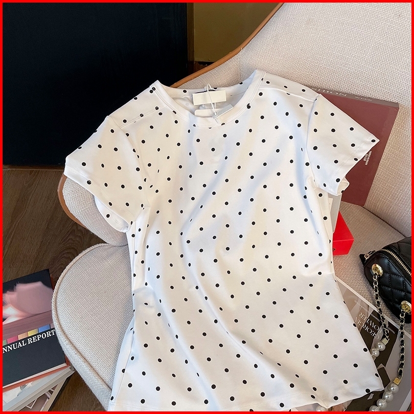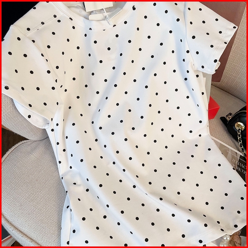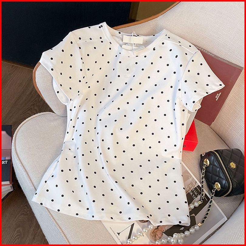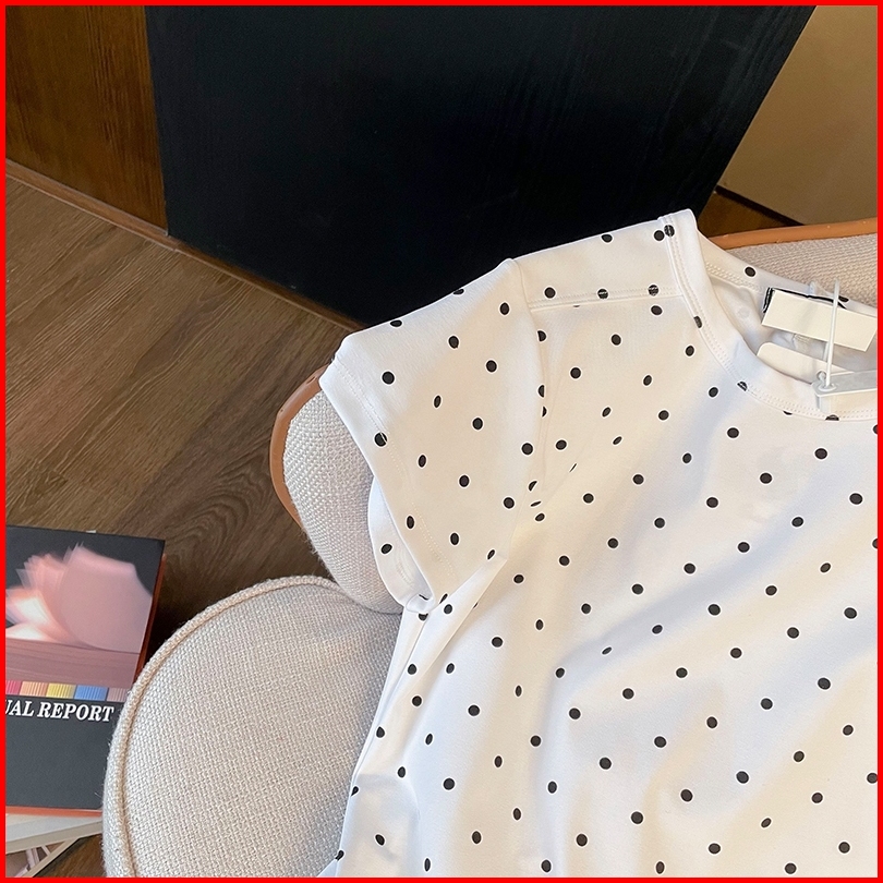 Kaus Leher Bulat Bergaris Polkadot Putih Baru Atasan Ketat Serbaguna Fashion Wanita Gaya Korea