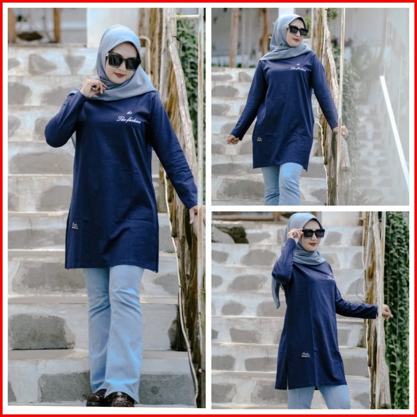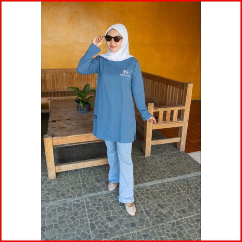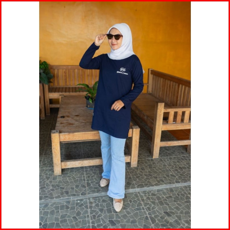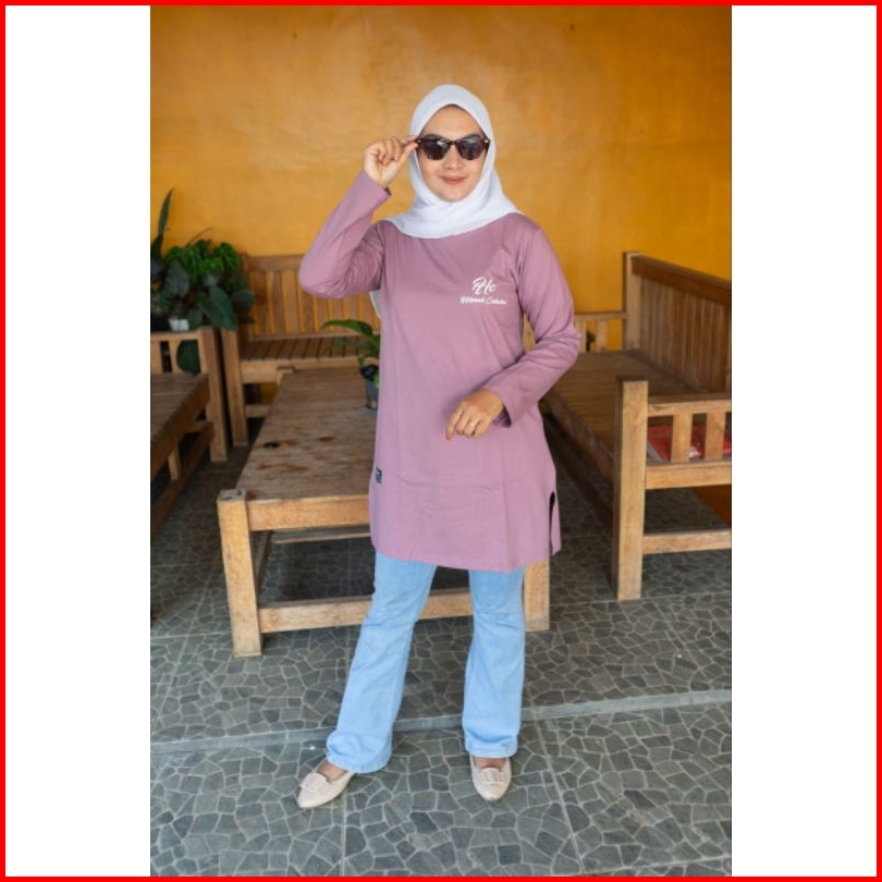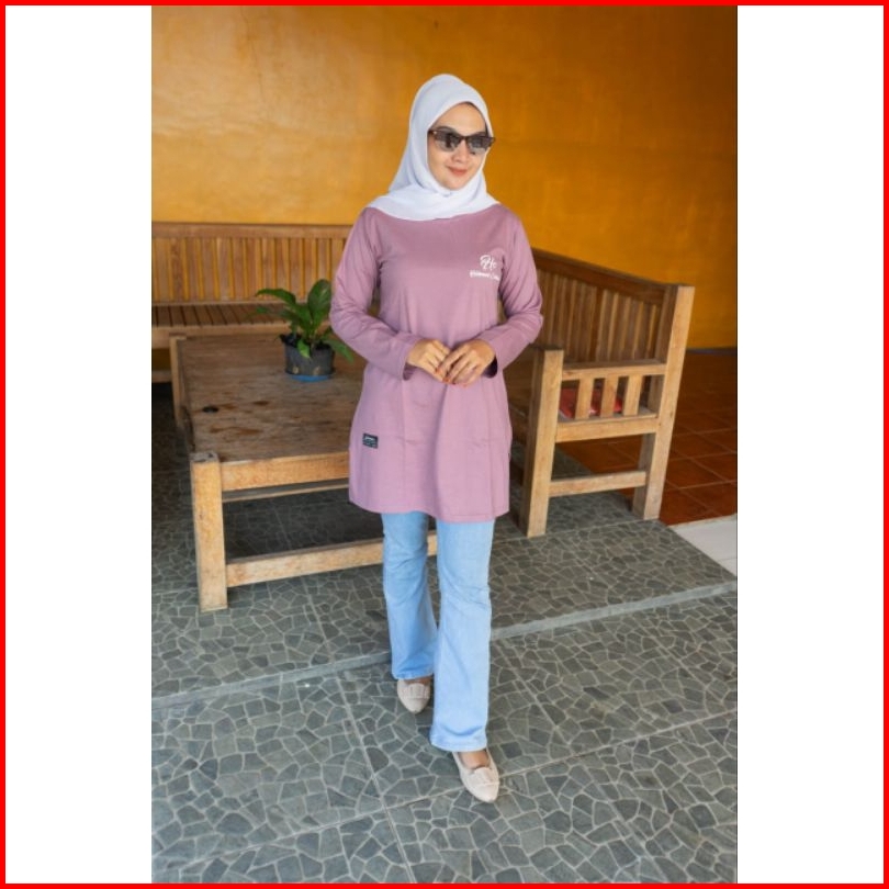Tunik Motip 01b Kaos Wanita Bahan Kombet 20s Lengan Panjang Oblong Jahitan Belah Pinggir