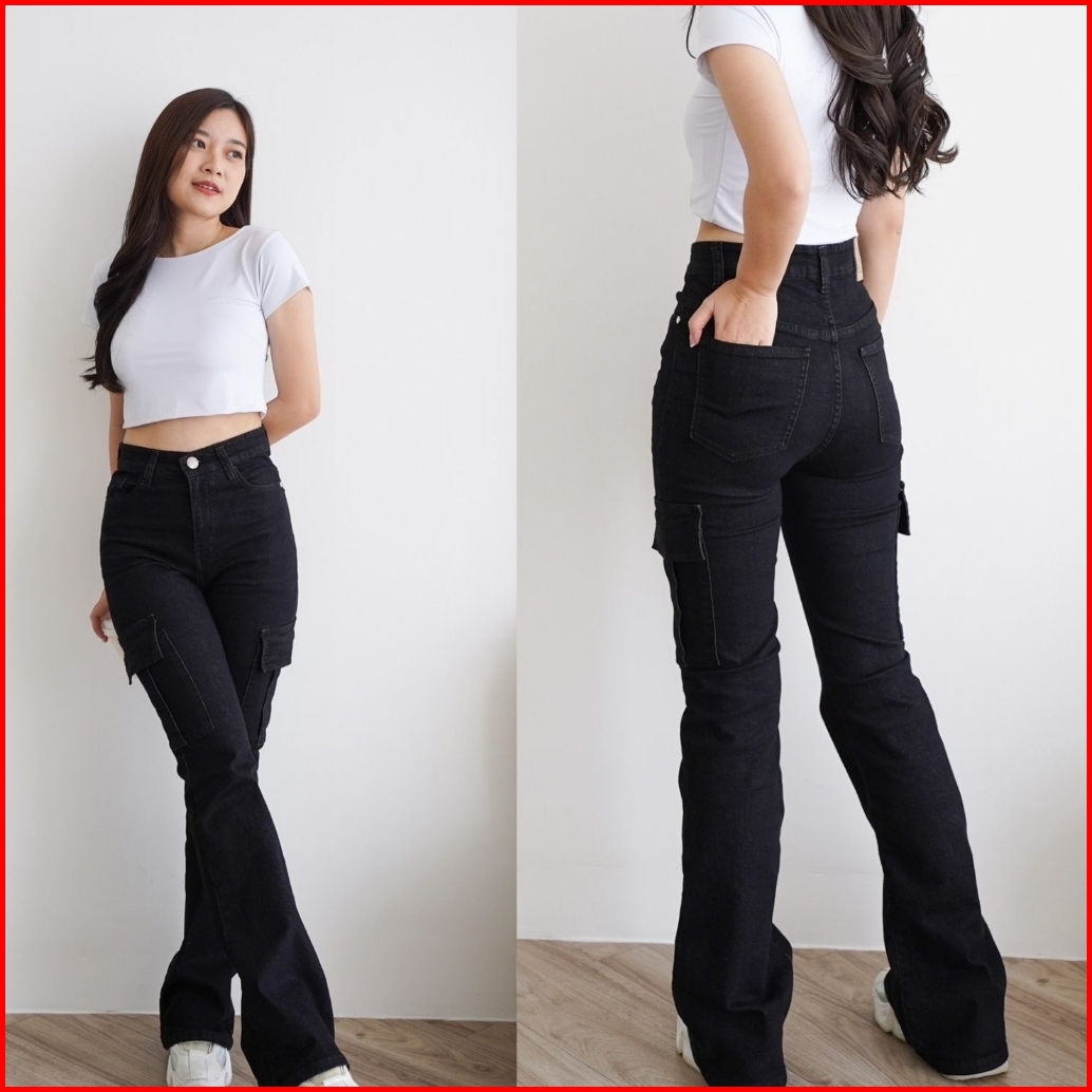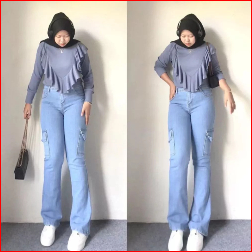 Celana Cutbray Cargo Jeans Wanita Highwaist Stretch Premium Kekinian Melar Panjang Fit Flared Loose