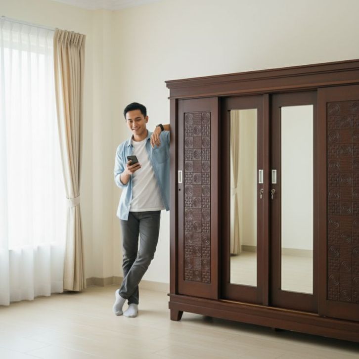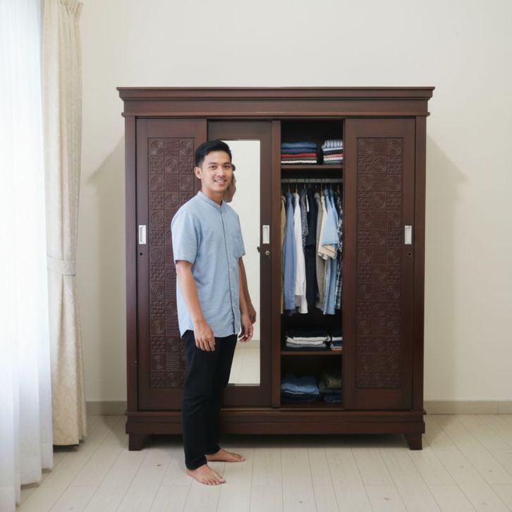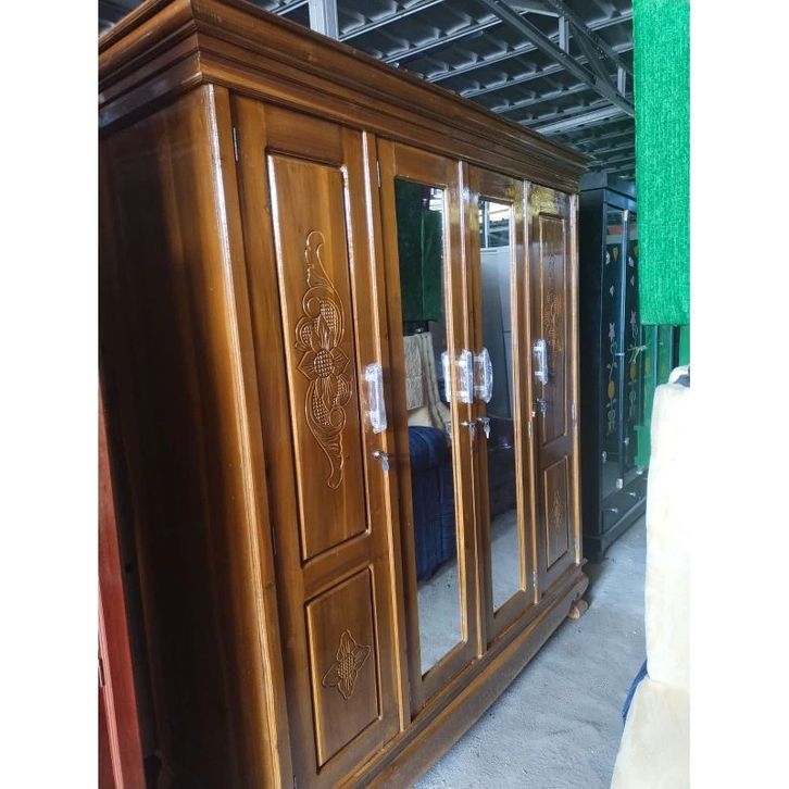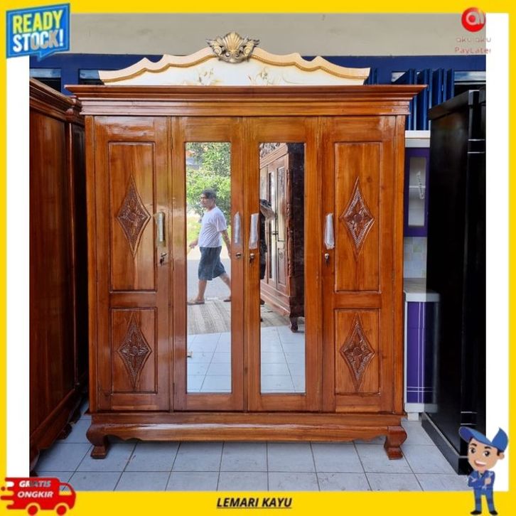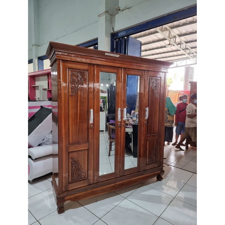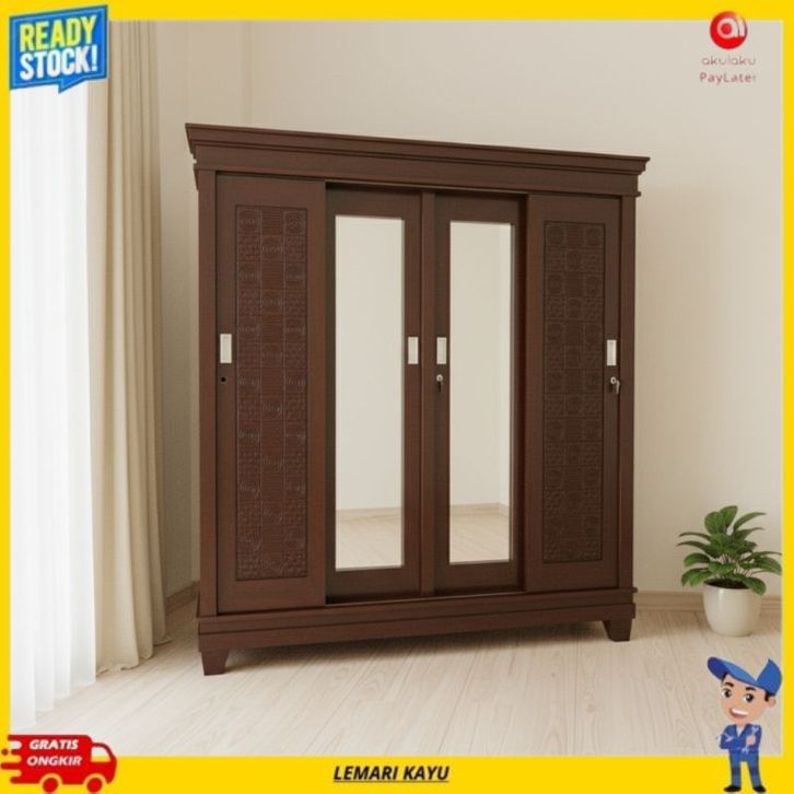 [Star] Lemari Pakaian Lemari Baju Kayu Jati 4 Pintu Buka tutup Sliding Cermin Kualitas Premium Lemari Kayu Pintu Geser