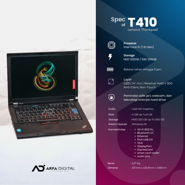 Laptop Untuk Pelajar Laptop Lenovo ThinkPad T410 Intel Core i5 Ram 8GB SSD 256GB Murah Bergaransi