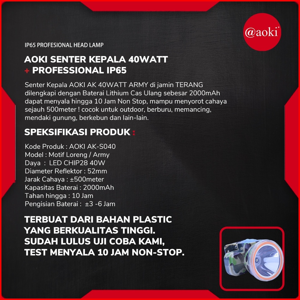 Aoki Senter Kepala Premium Professional 40w 2000mah Ip65