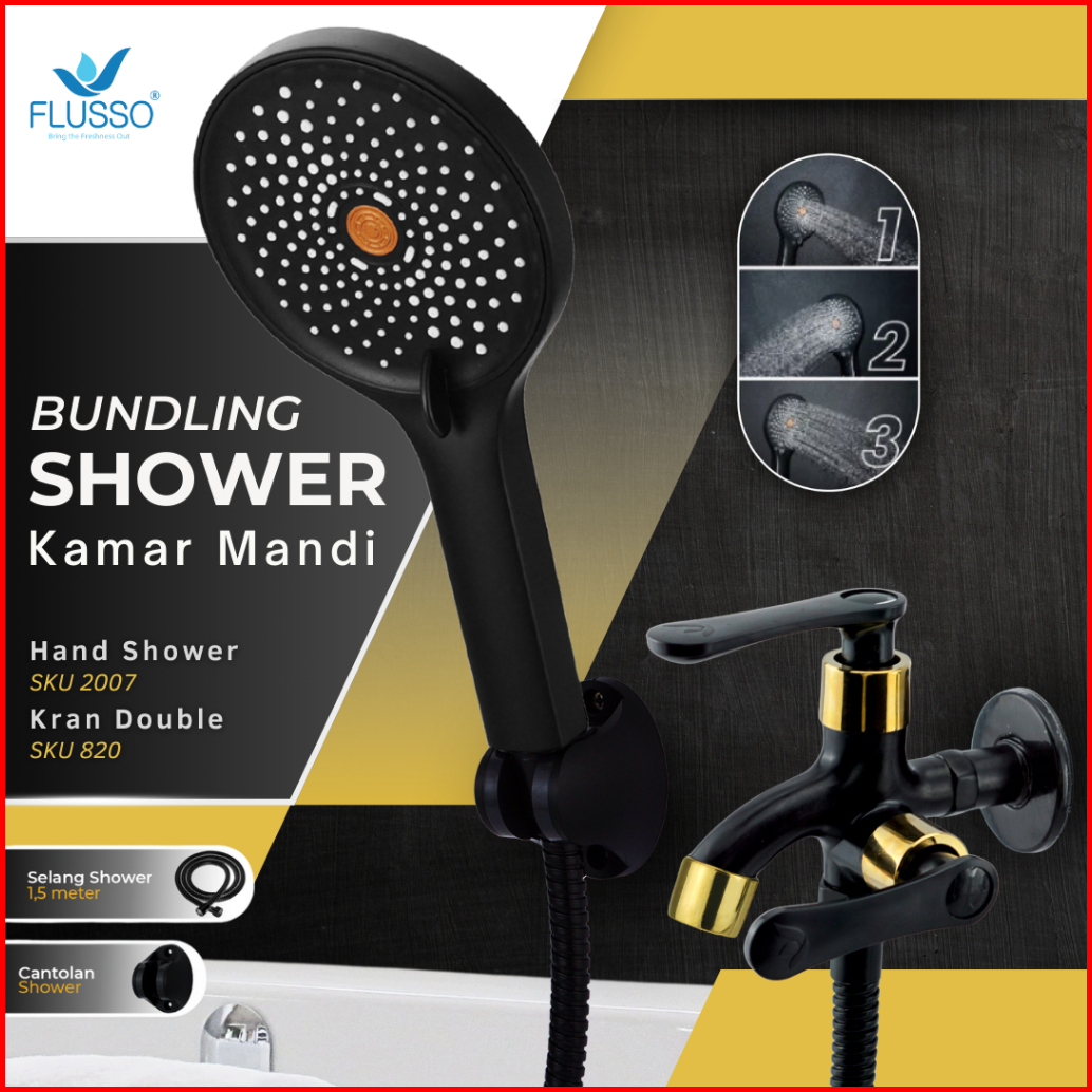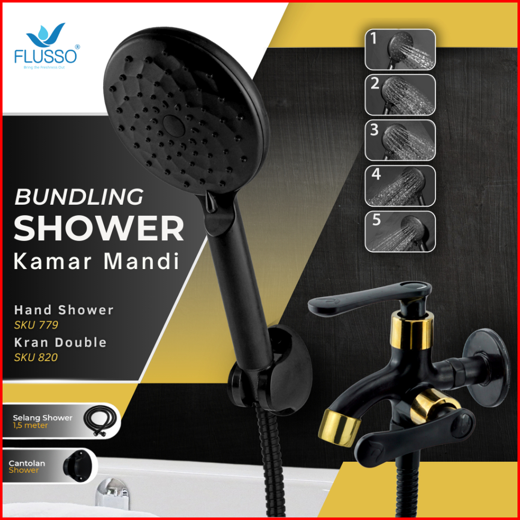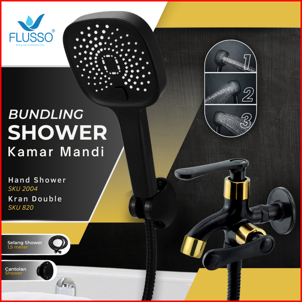 Flusso Paket Hemat Shower Set Komplit Kran Double Shower Black Kuningan Original 820