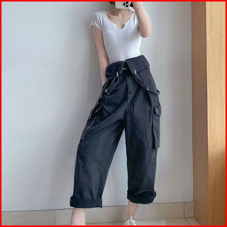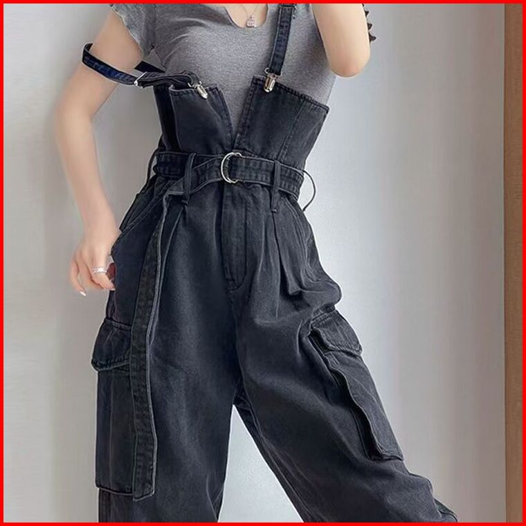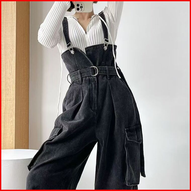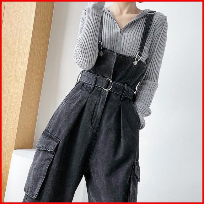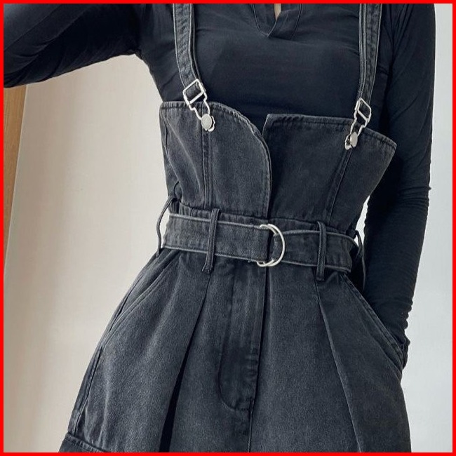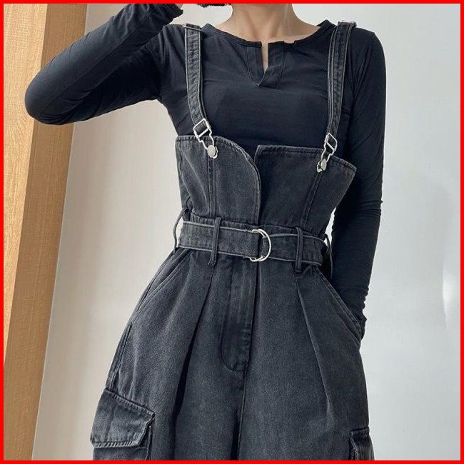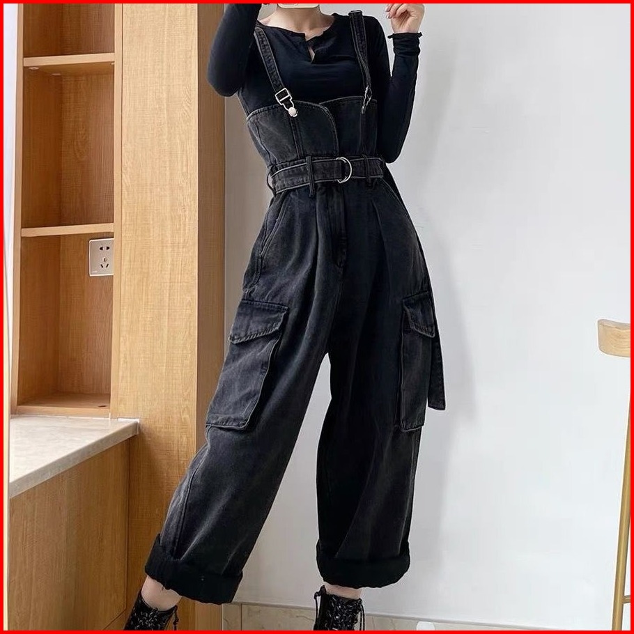Nana Hitam Overall Denim Kaki Lebar Jumpsuit Pinggang Ramping 016