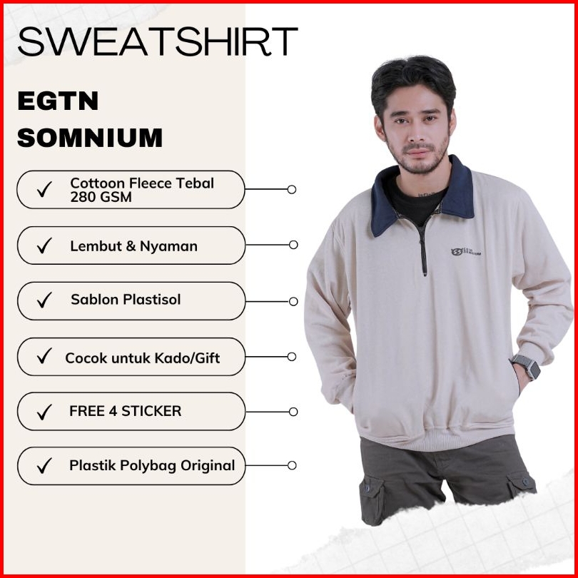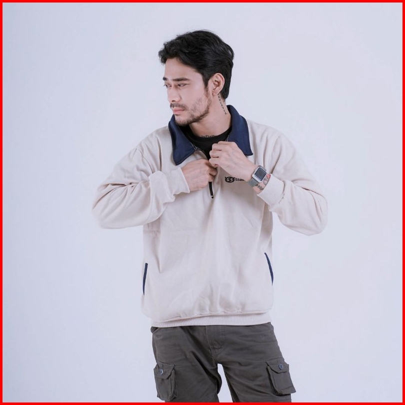 Egtn Somnium Sweater Rugby Kerah Zipper Warna Cream Beggie Kombinasi Navy Halfzip Model Vintage Pria Wanita