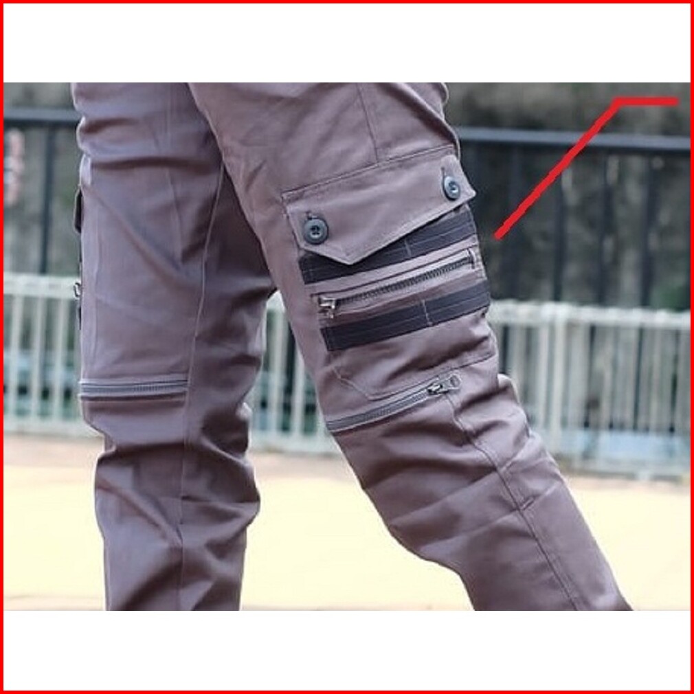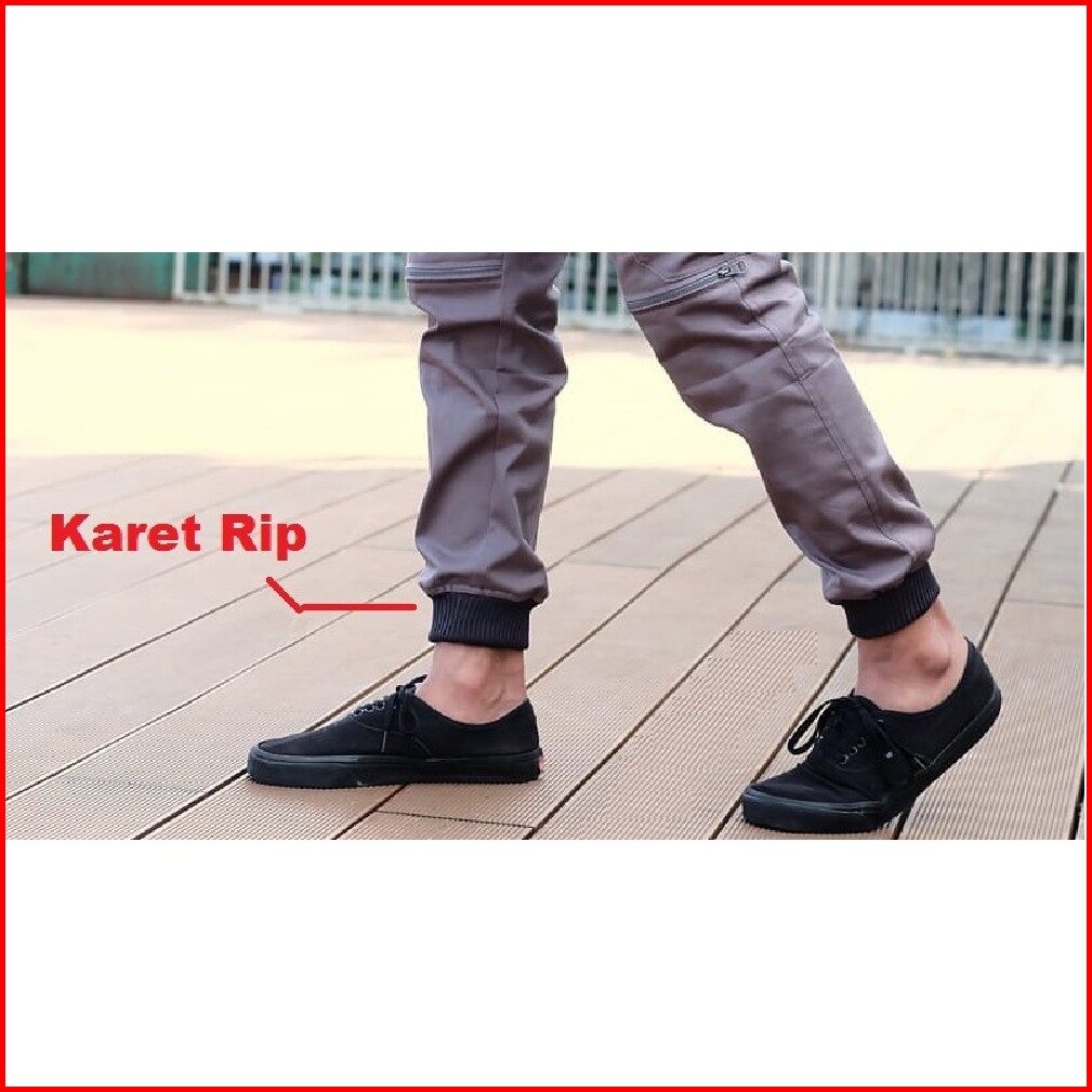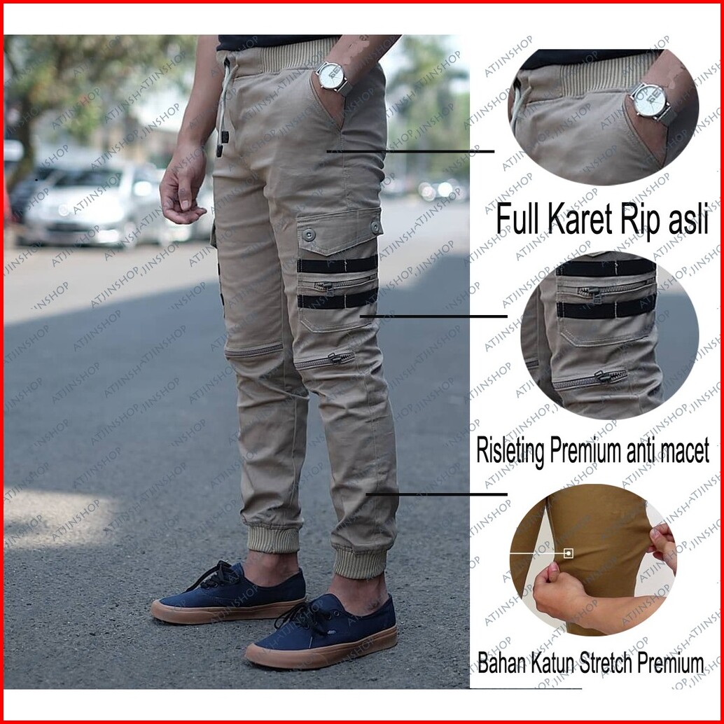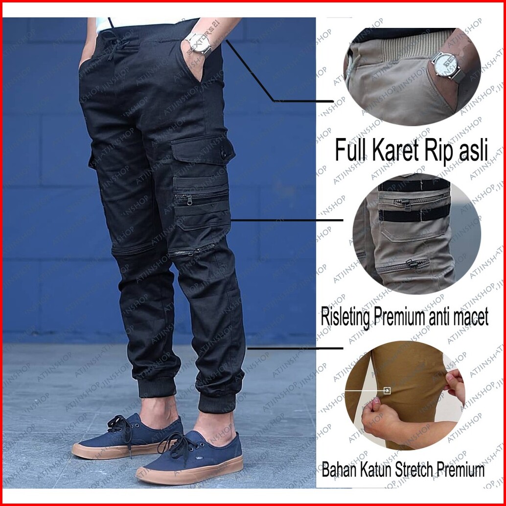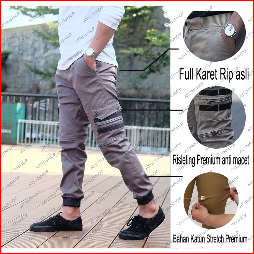 Atjin- Celana Joger Kargo Korea Bahan Twill Tebal Slim Fit Hitam-abu-krem