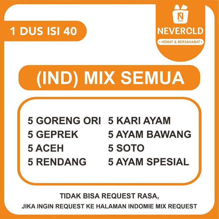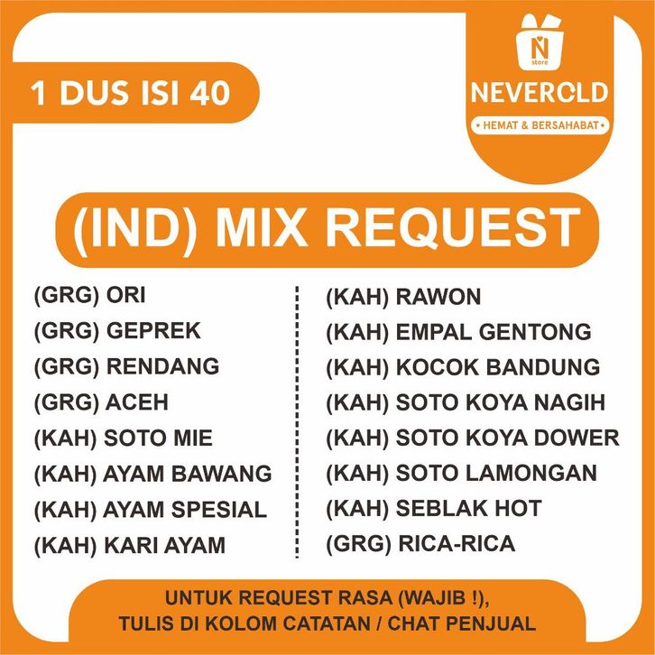 (IND) MIX REQUEST, (IND) MIX 8 VARIANT, (IND) GORENG, (IND) SOTO, (IND) AYAM SPESIAL, (IND) AYAM BAWANG, (IND) RENDANG, (IND) KARI AYAM, (IND) AYAM GEPREK, (IND) GORENG ACEH, (IND) SEBLAK HOT, POPMIE MIX, POPMIE AYAM, POPMIE SOTO, POPMIE BASO, POPMIE KARI, (IND) RAWON MERCON, POPMIE GORENG ORI, (IND) SOTO NAGIH, (IND) SOTO DOWER, (IND) MIX KUAH 4 VAR, (IND) MIX GRNG 4 VAR, (IND) MIX KULINER, (IND) GR, KR, ST, AB, (IND) GR, ST, AB, (IND) GR, ST, (IND) GR, AB, (IND) GR, KR, (IND) BANGLADESH'E, (IND) KOCOK BANDUNG, (IND) EMPAL GENTONG