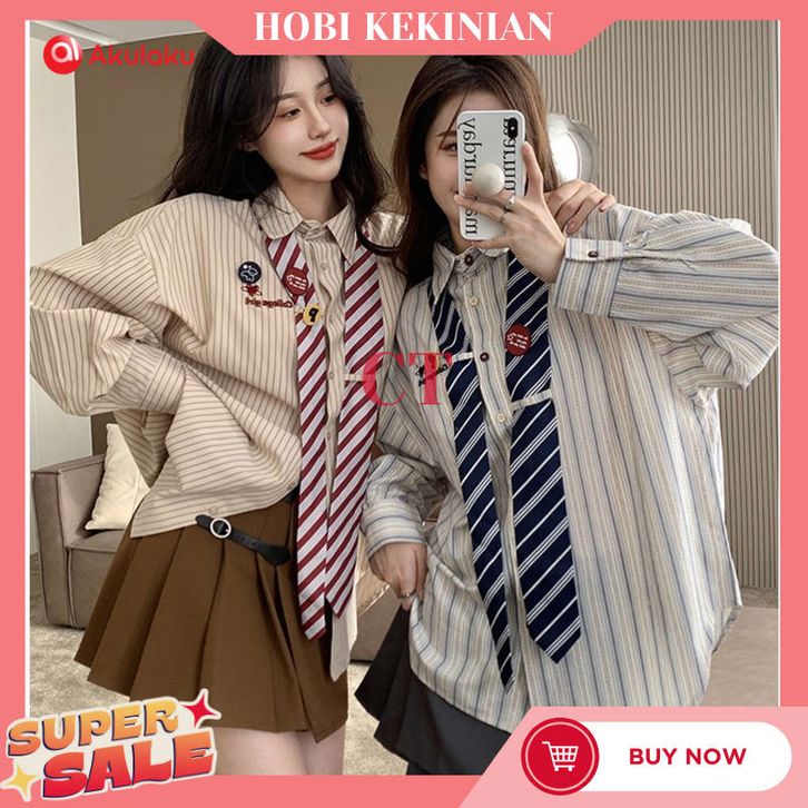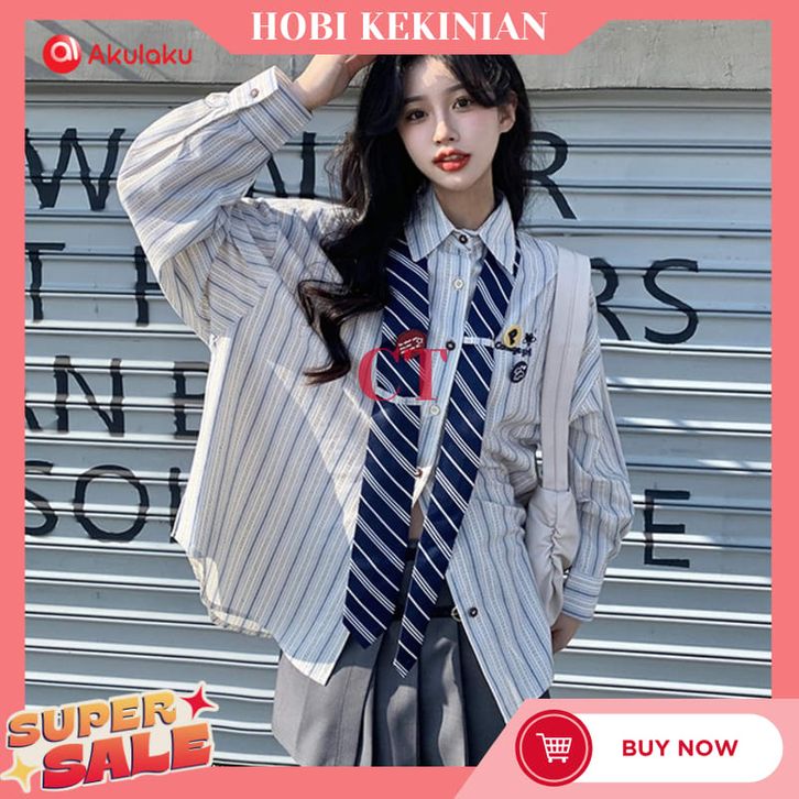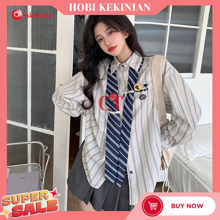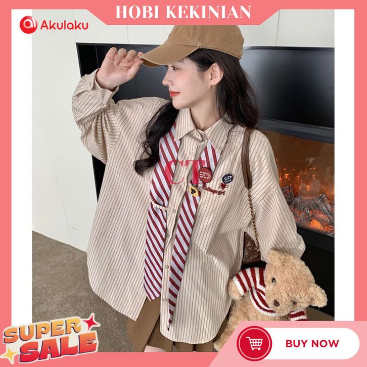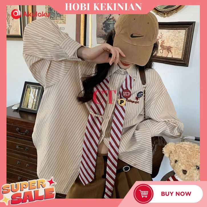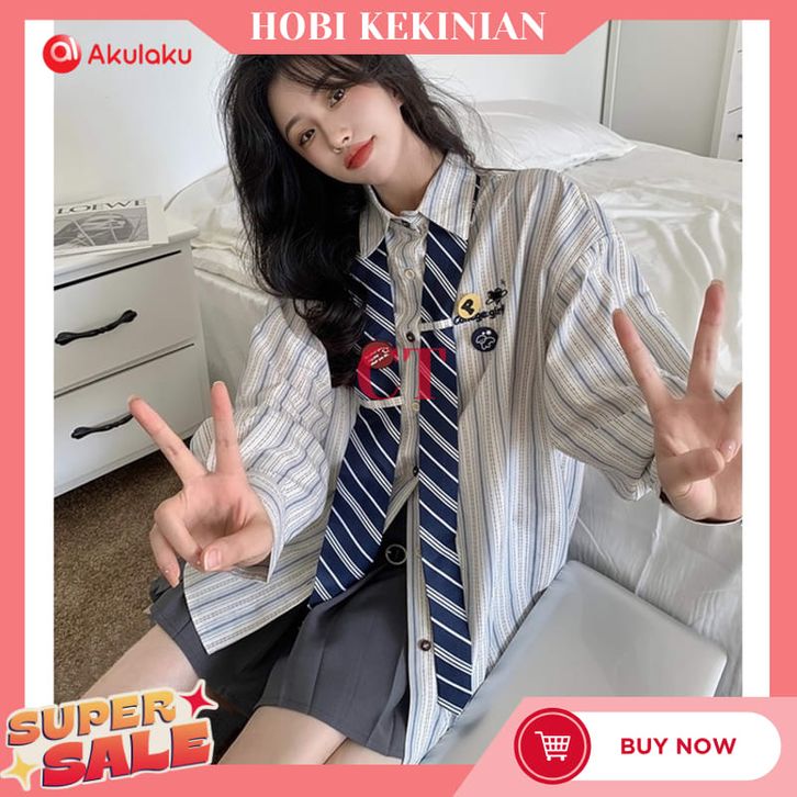 Kemeja Wanita Lengan Panjang Bergaris Atasan Kemeja Modis Longgar Gaya Korea Bonus Dasi Lencana