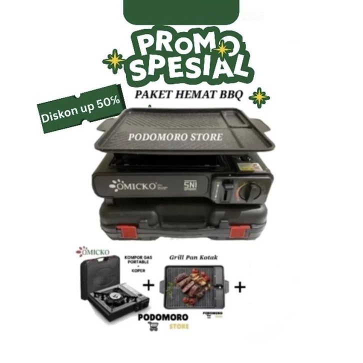 PAKET KOMPOR PORTABLE OMICKO 2 IN 1 / KOMPOR BBQ PORTABEL PLUS COVER SNI
