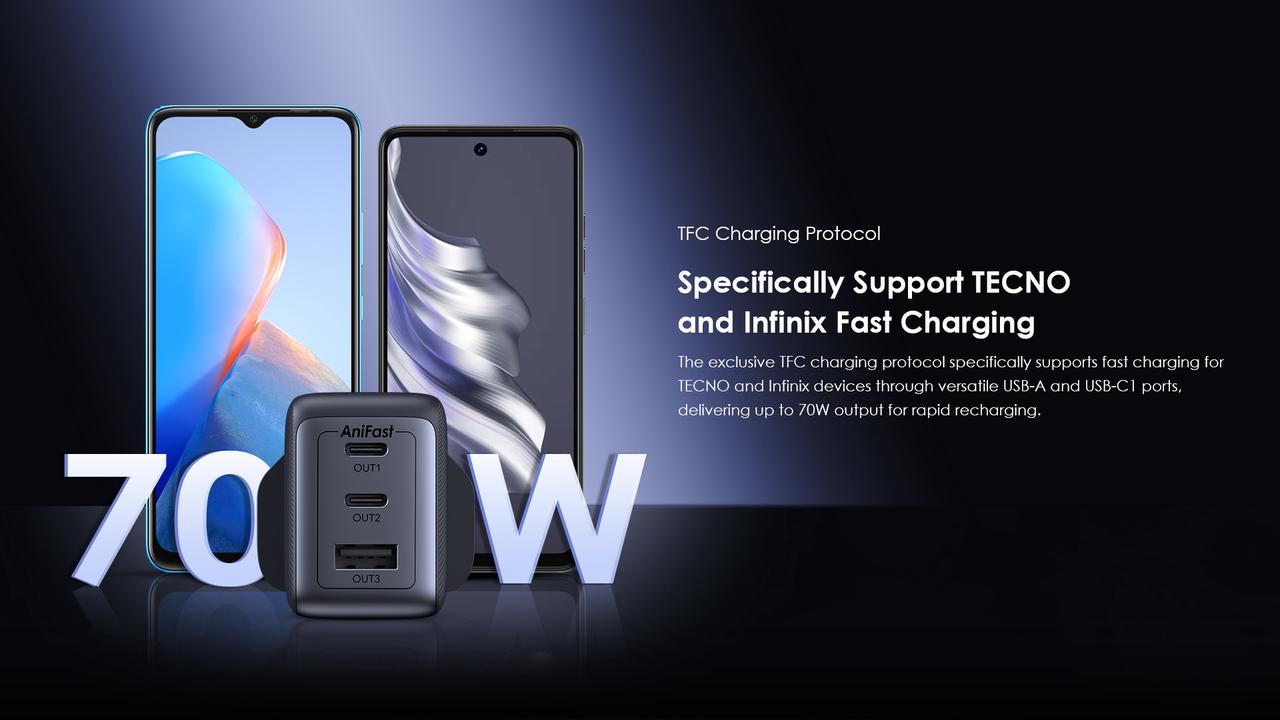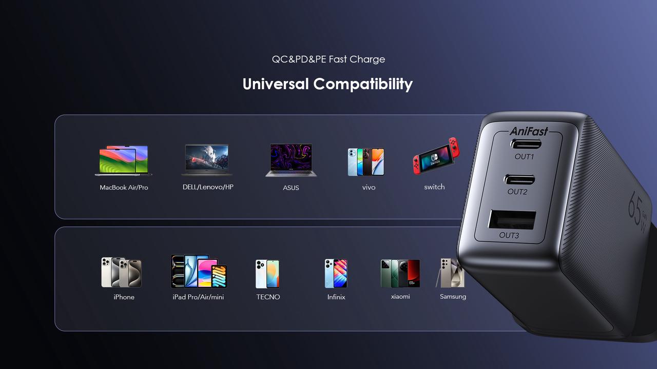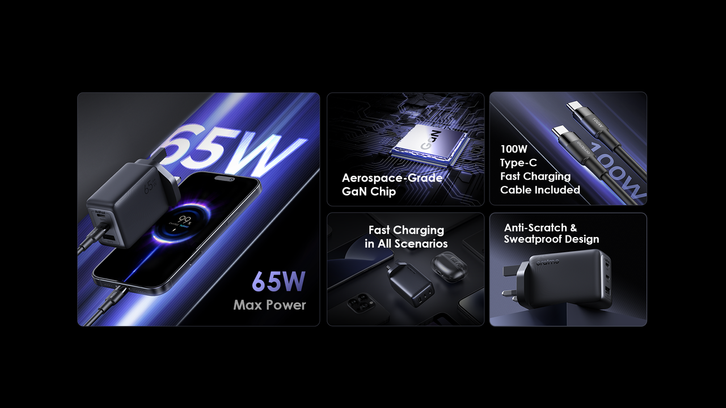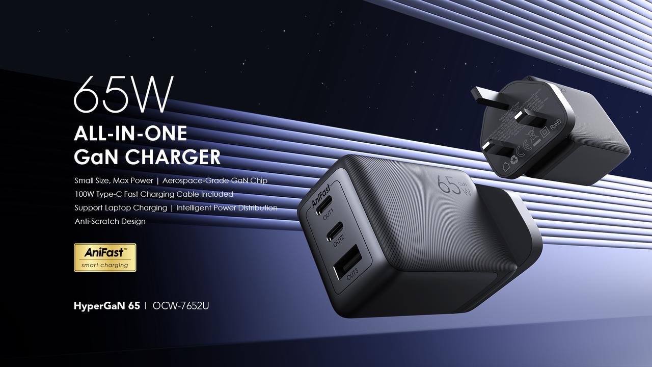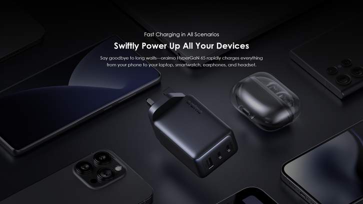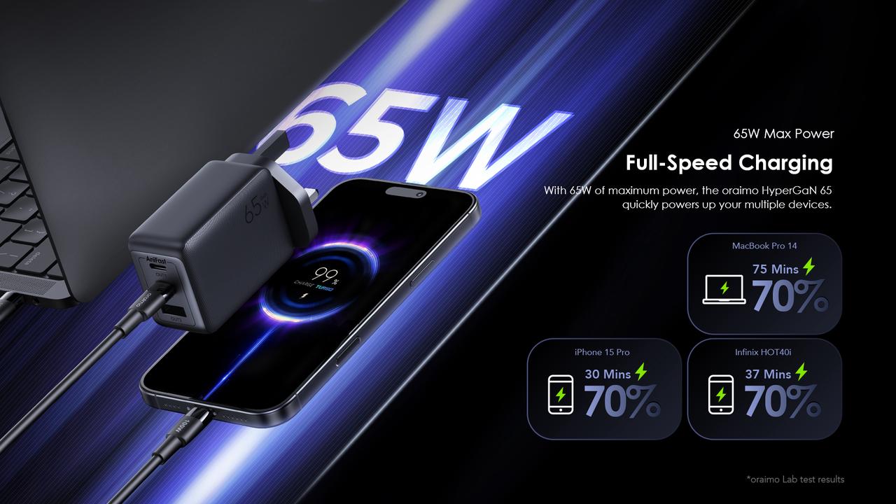 oraimo Portable Adaptor Charger HyperGan 65W Triple Output OCW-7652E+116CC Support Laptop Fast Charging Free Cable 5V 3A