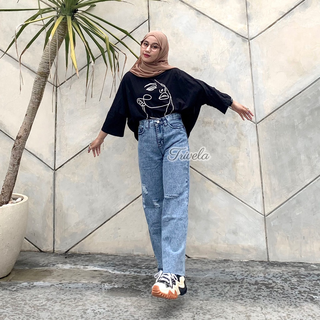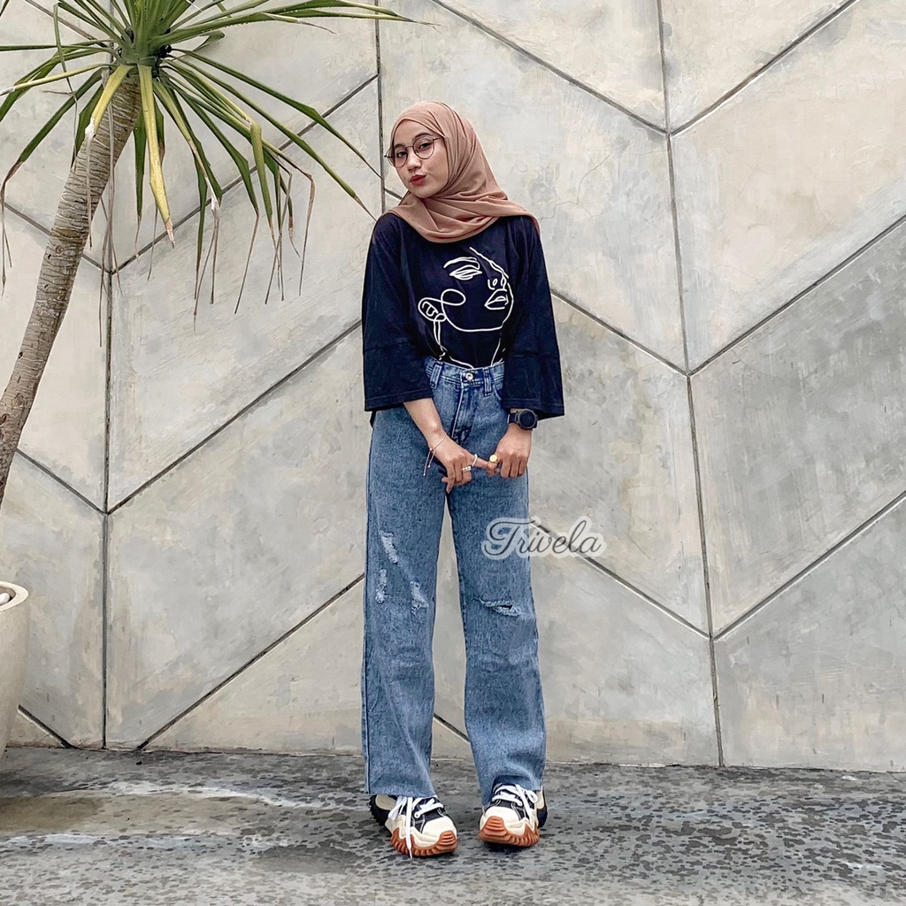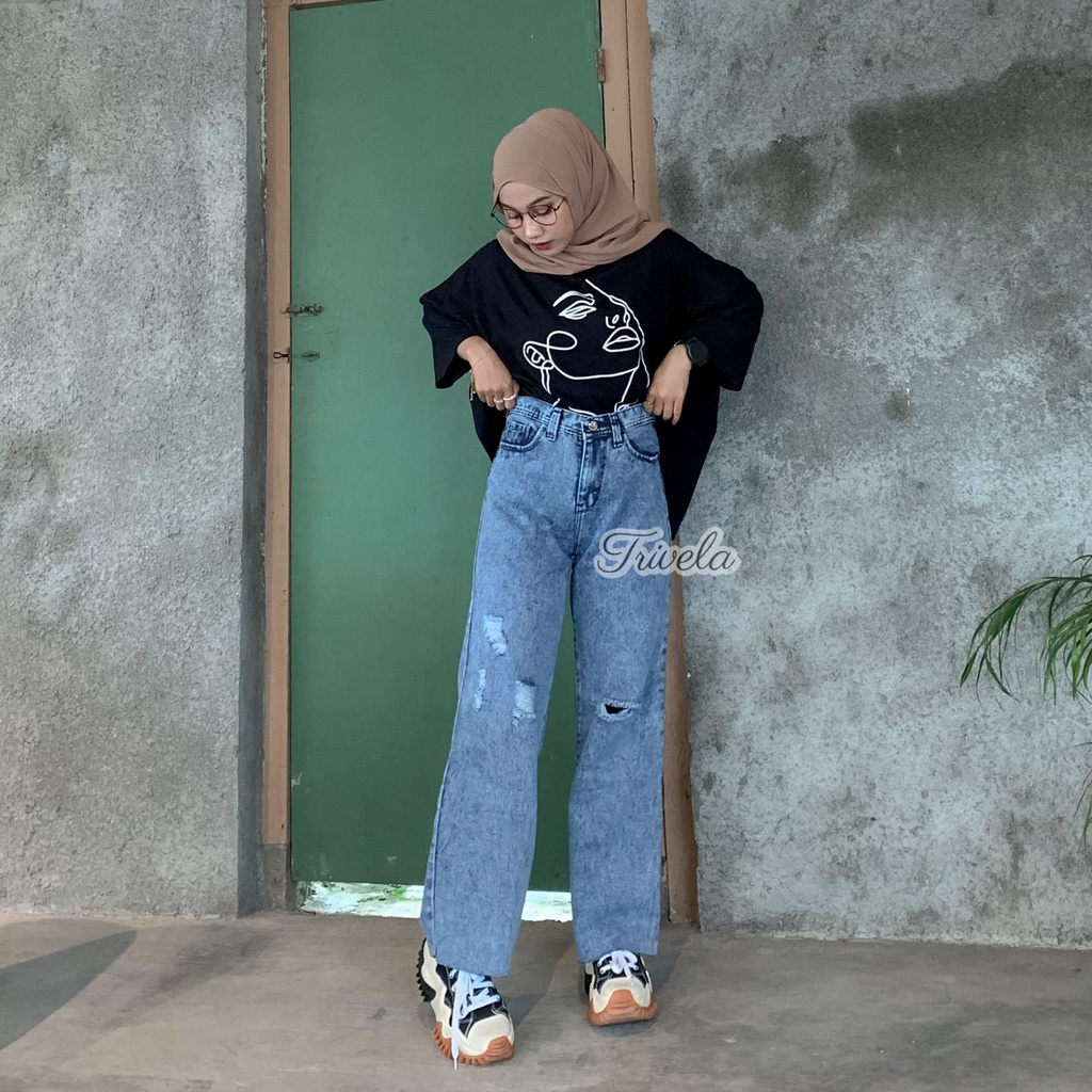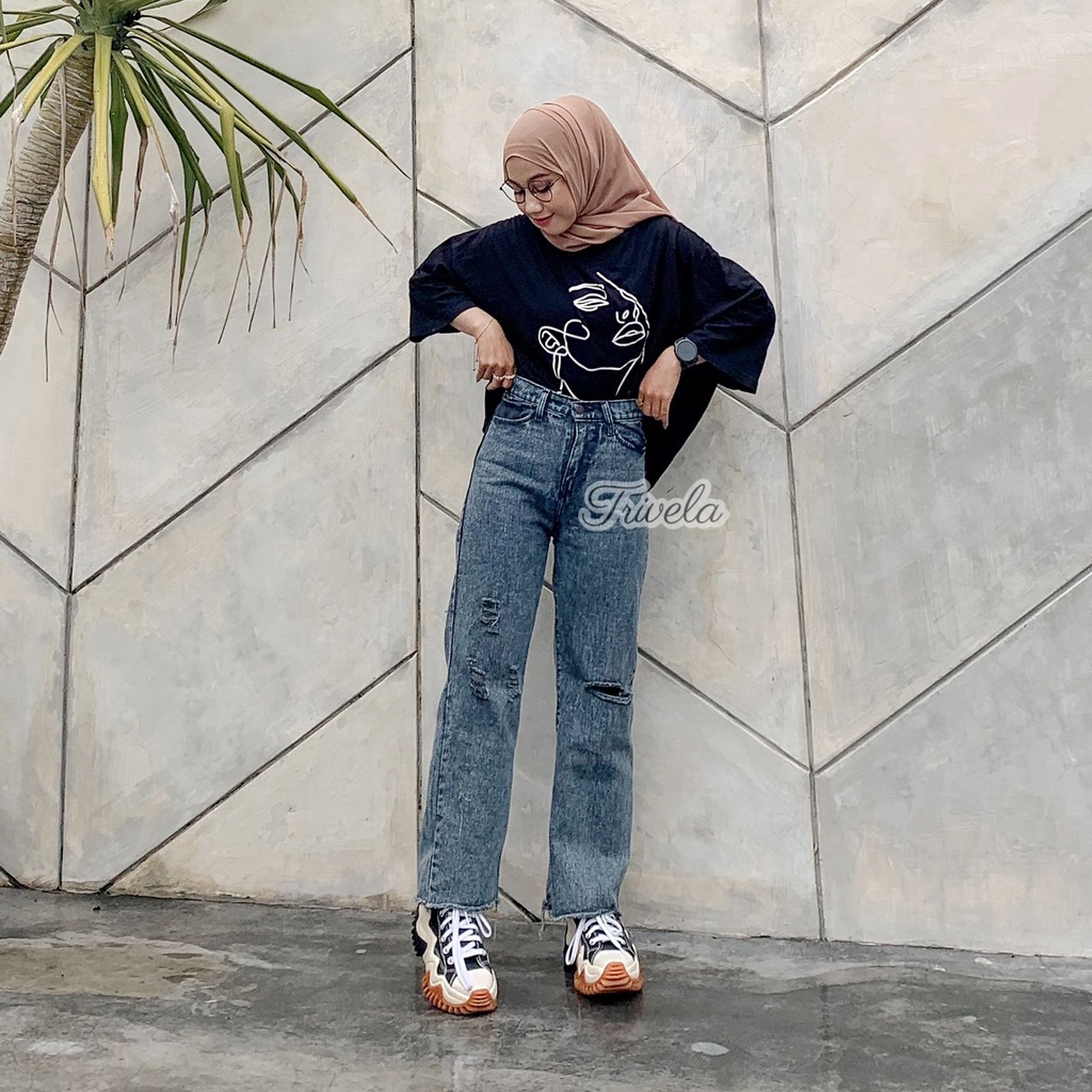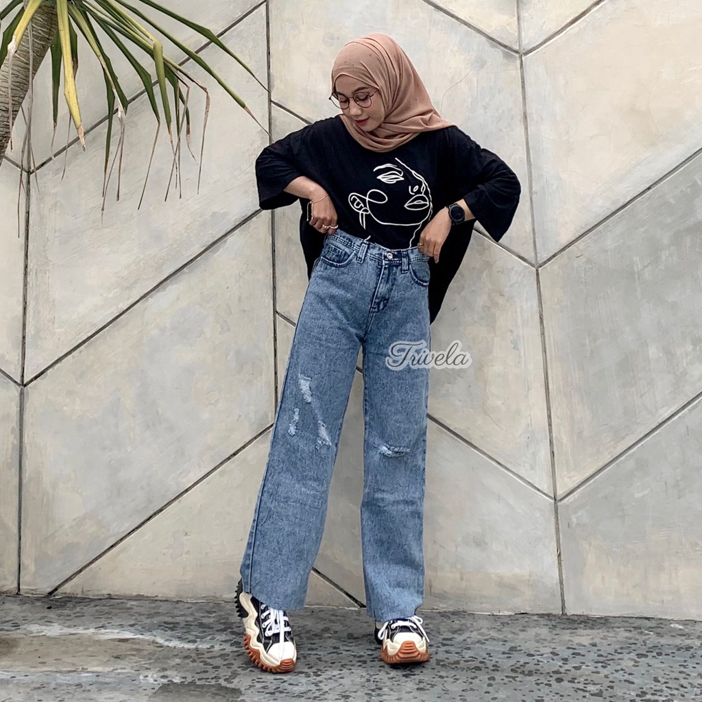 (Gratis Ongkir) TRIVELA - Kulot Snow Sobek / Kulot Jeans Ripped Unfinished / Lally