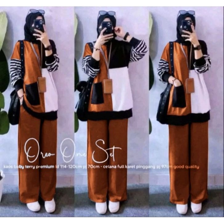 One Set Muslimah Wanita Dua Warna Korean Fashion Style Lengan Panjang Kekinian Set Kasual Cewek All Size Premium