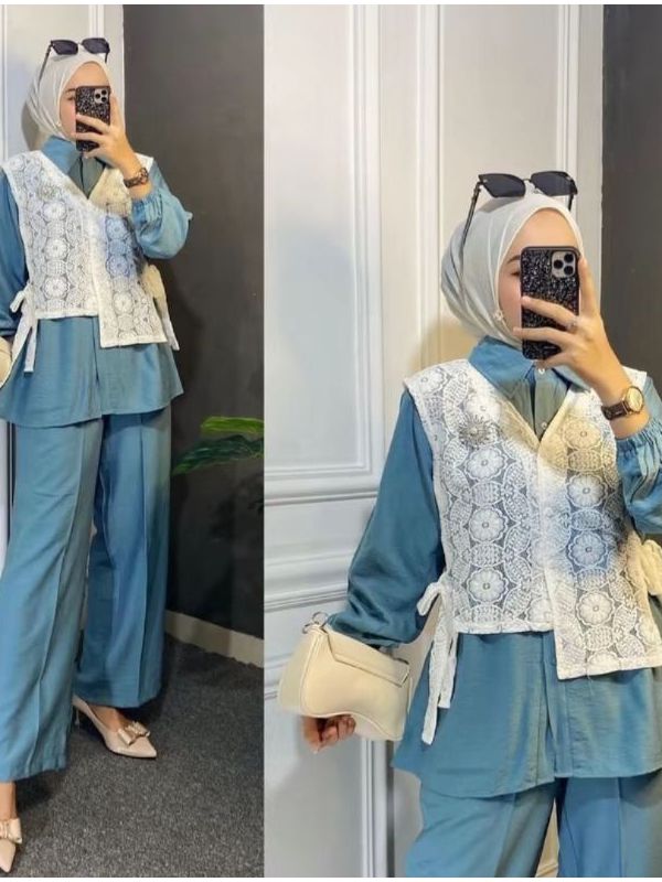 One Set Cringkel Vest Brukat Outfit Wanita Kekinian Atasan Wanita Rompi Brukat Lengan Panjang Set Wanita Muslimah