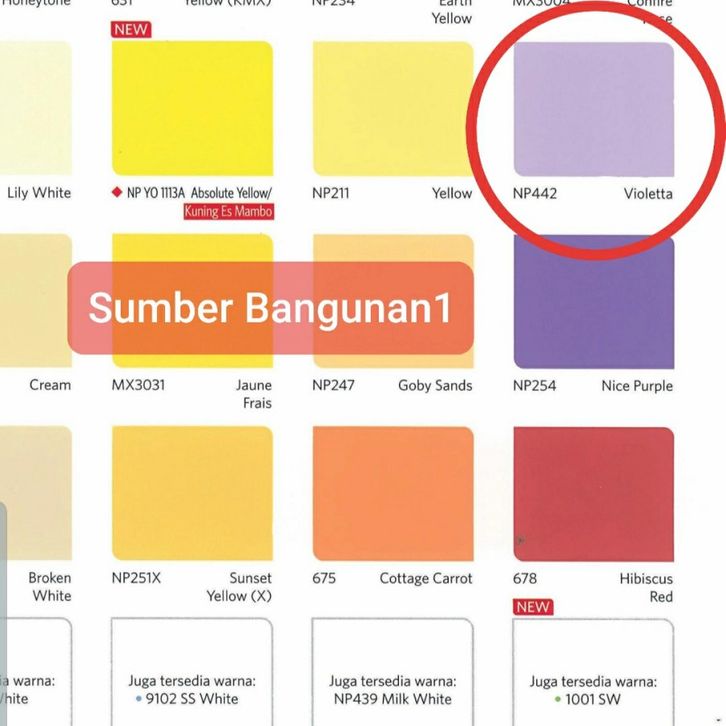 1619T Green Gauze, 1681D Spring Vigor, 245 Marina, 659 Misty Blue, 661 Pink, 667 Mint Green, 675 Cottage Carrot, 678 Hibiscus Re, 686 Light Pewter, 687 Miner Grey, BS3033 Broken White, BS3040 Cream, BS8090 Sakura, MX3004 Confire Rose, MX3015 Bleu Riv, MX3031 Jaune Frais, NP214 Purple White, NP218 Tropical Grey, NP222 Latansa Green, NP227 Charcoal, NP231 Harbor Blue, NP240 Honeytone, NP243 Lily White, NP249 Sky Blue, NP254 Nice Purple, NP273 Blue White, NP440 Natural Cream, NP442 Violetta, Putih 9102, Warna Lainnya