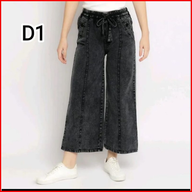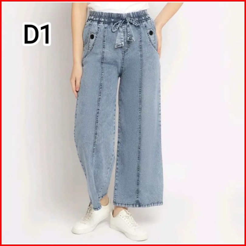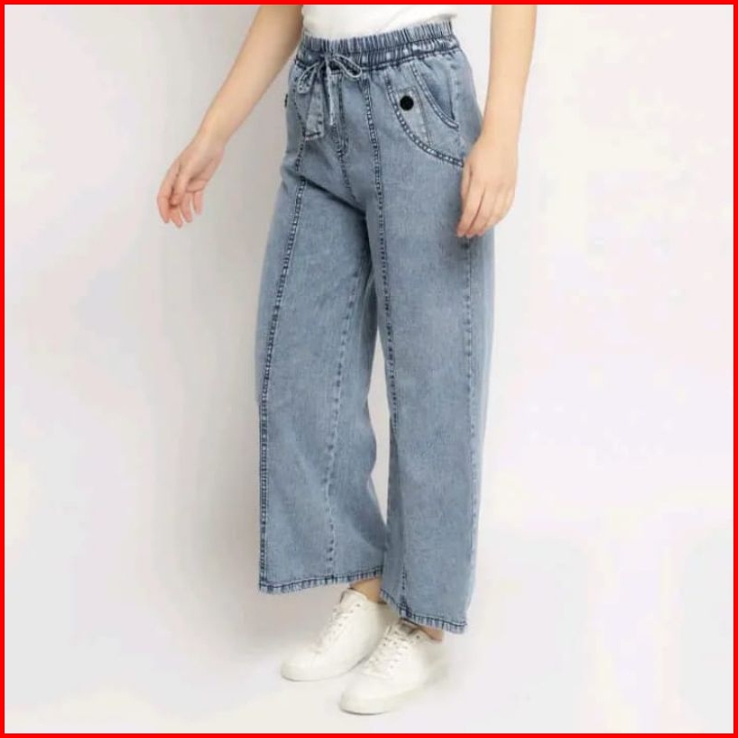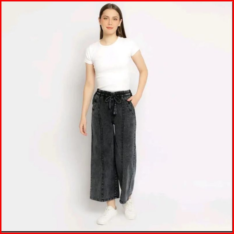 Celana Kulot Jeans Wanita Palazzo Denim Bawahan Jeans Pinggang Karet Thofaro D1