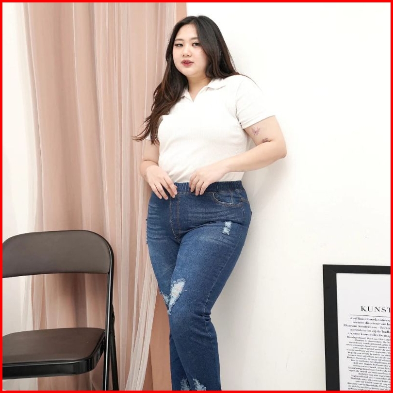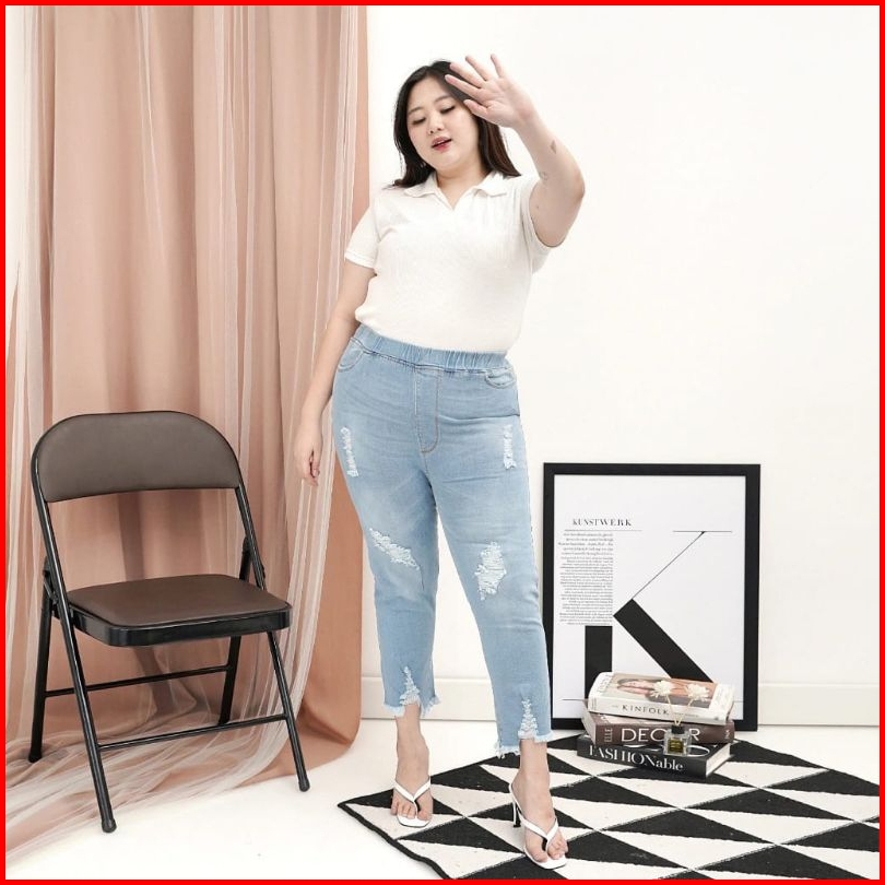 Size 31-42 Jeans Wanita 7 9 Jumbo Ripped Pinggang Full Karet Soft Jeans Wanita Model Sobek
