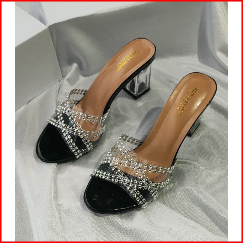 Sendal Heels Hak Kaca Tali Permata Empuk 7cm