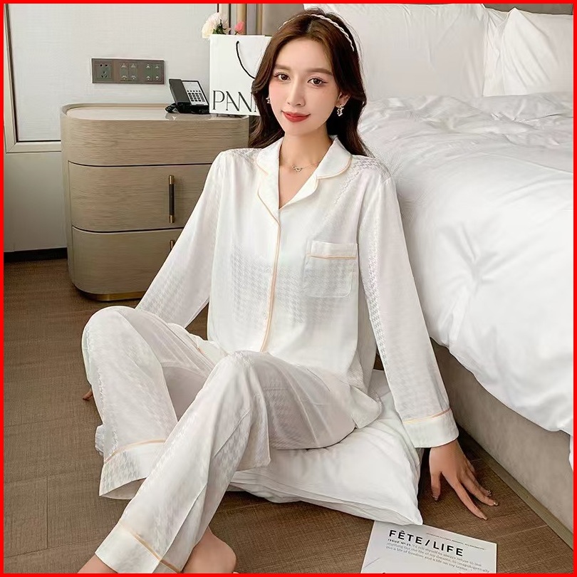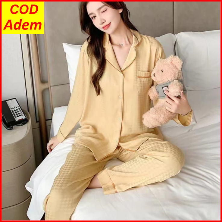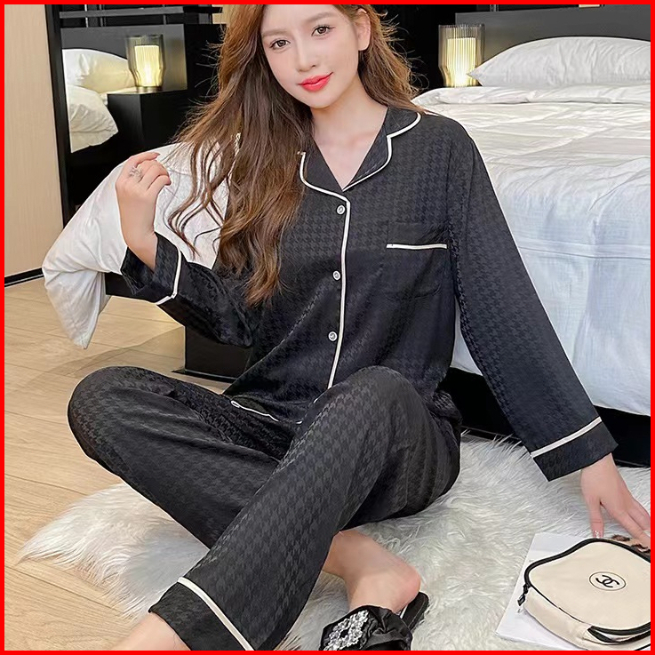 Codpiyama Satin Wanita Lengan Panjang Pakaian Rumah Polos Houndstooth Korea Style