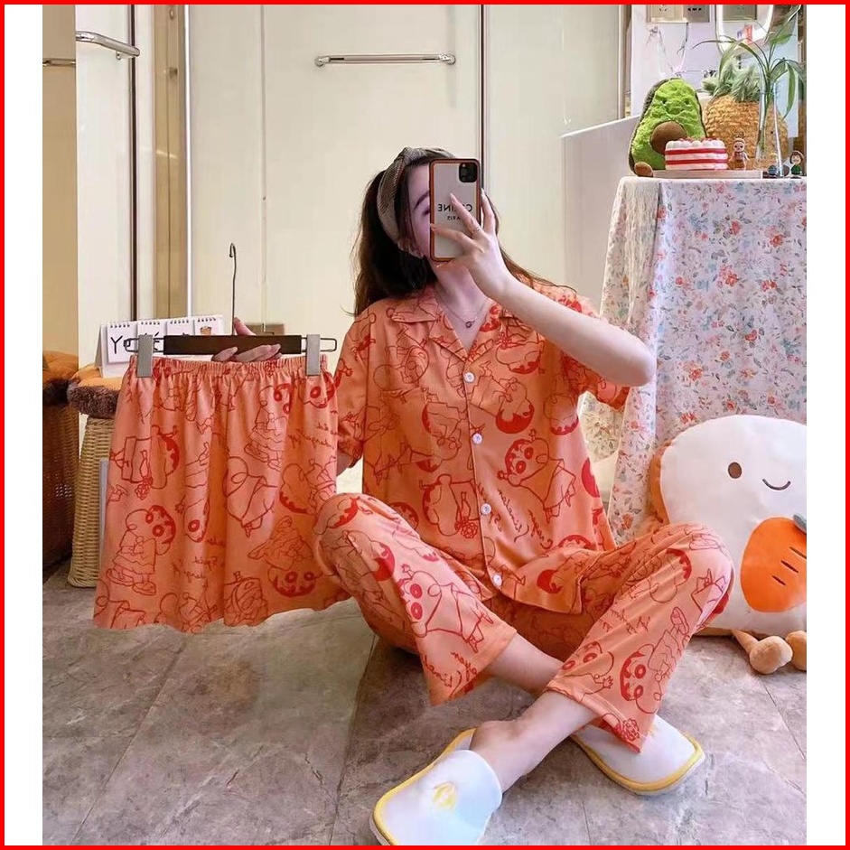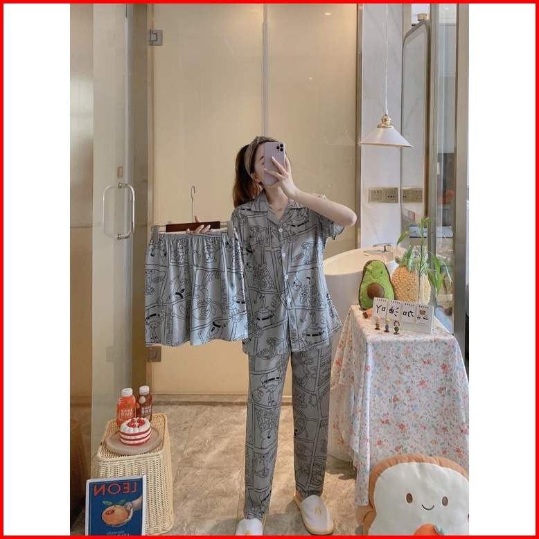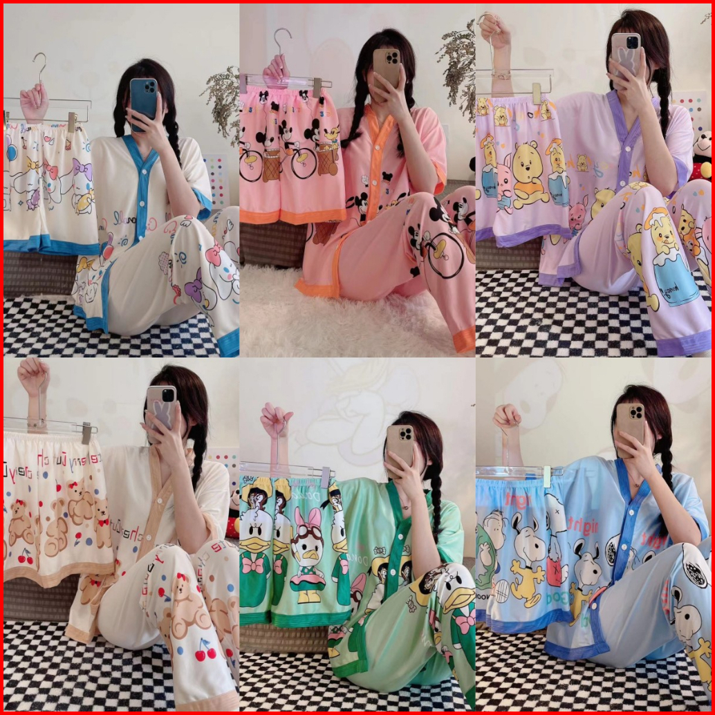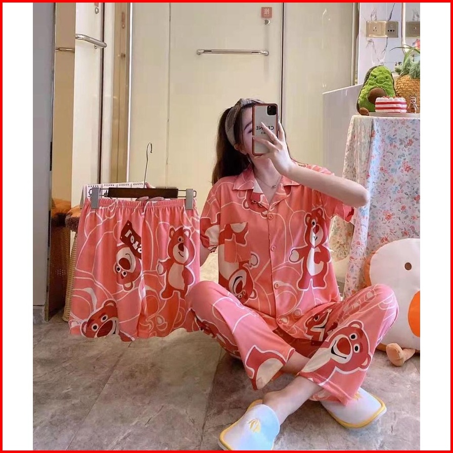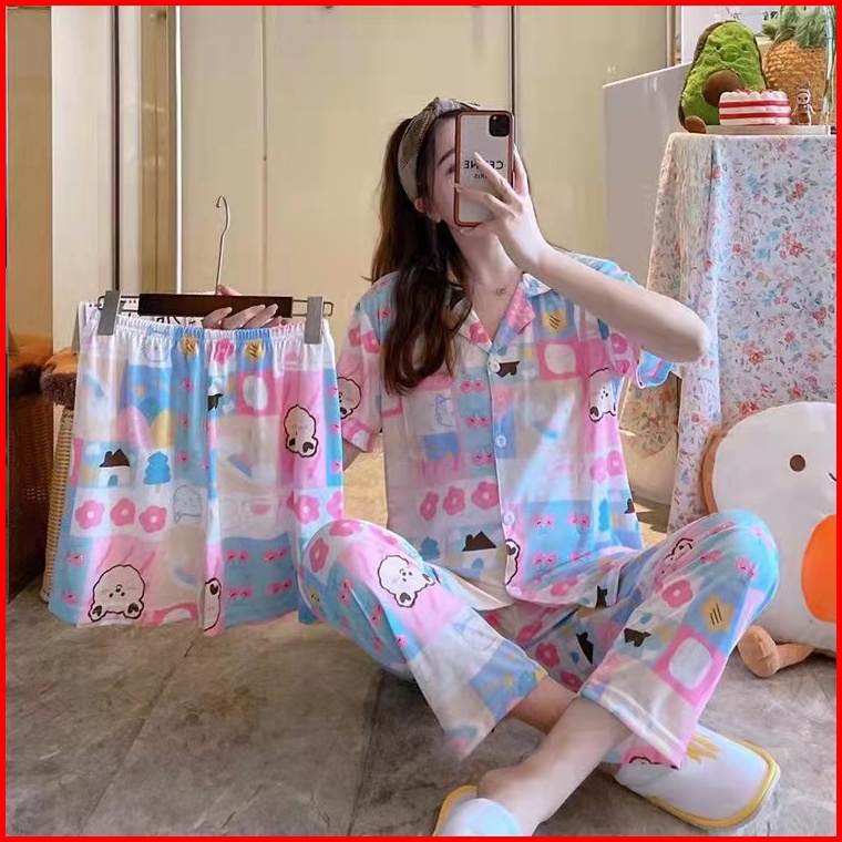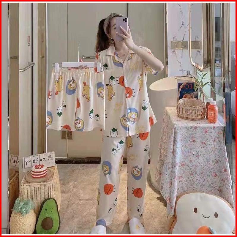 Piyama Kancing Depan Import Set 3in1 Satu Baju Dua Celana Baju Tidur Kancing Depan Piyama Kancing Pendek Baju Tidur Wani