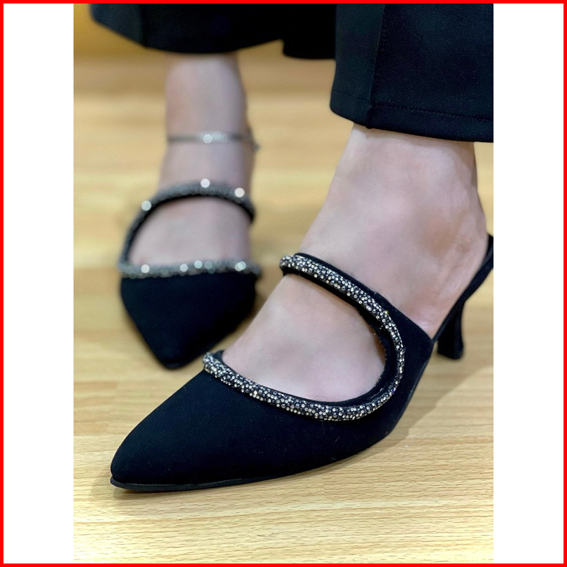 Zr Diana Box Polos - Women Mules Heeled 7cm Sepatu Sandal Heels Wanita Permata Blink-blink