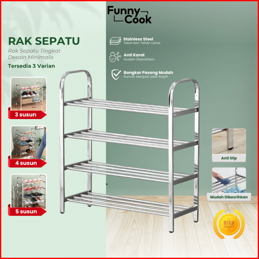 Funnycook Rak Sepatu Sandal Stainless Steel Portable Kuat Anti Karat Tempat Sepatu Multifungsi 3 4 5 Tingkat