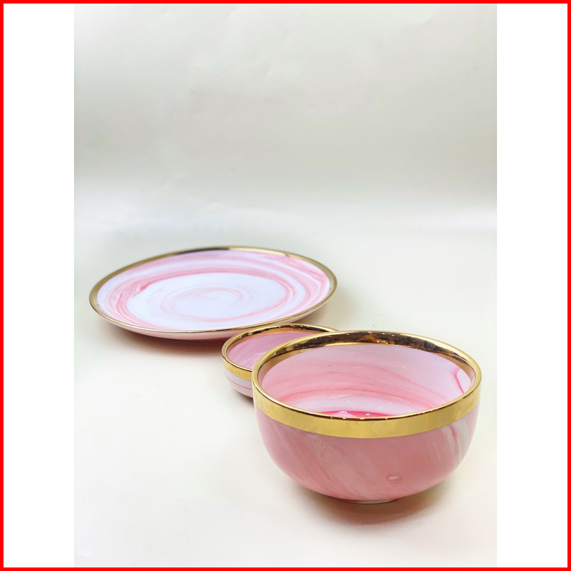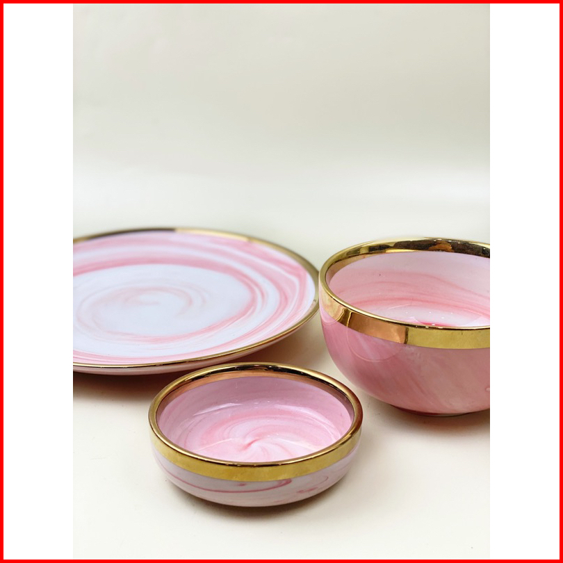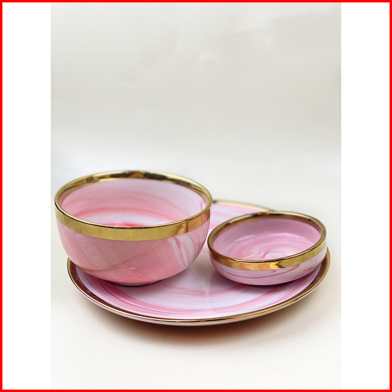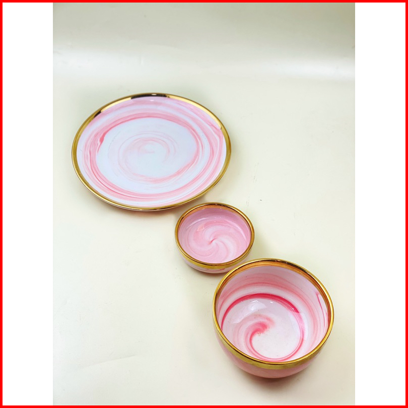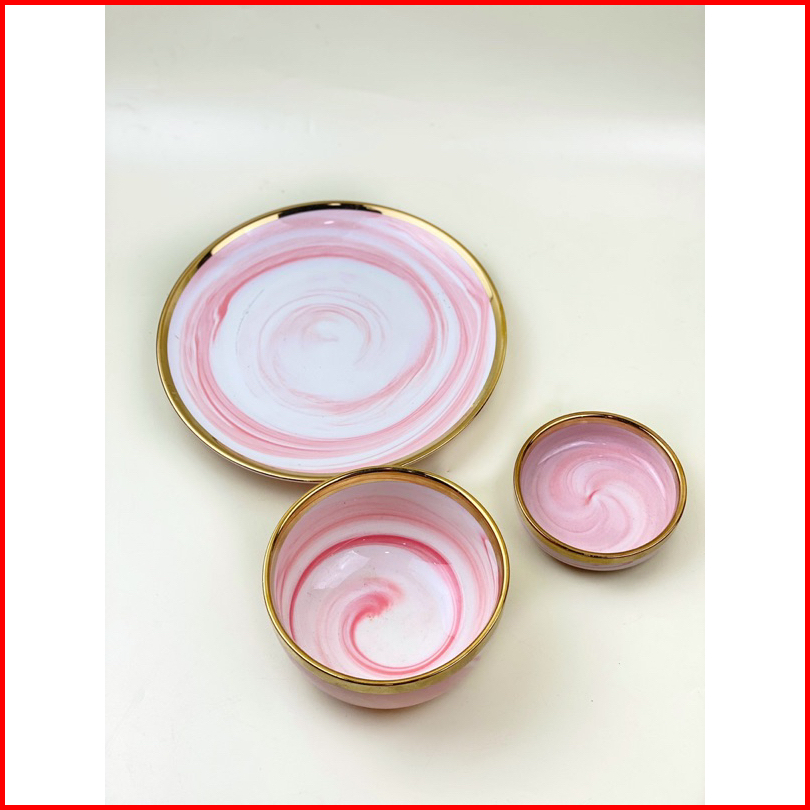 Ashome Piring Set 1 Orang Piring Makan Set Pink Marble Isi 3 Pcs Piring Set Keramik List Piring Set Mewah Piring Sultan