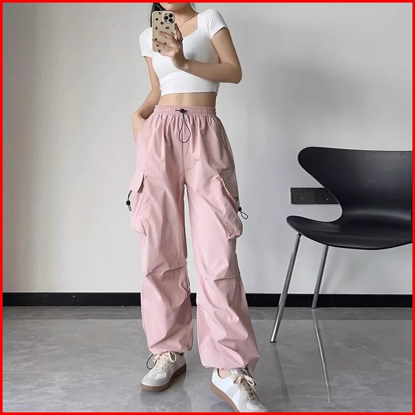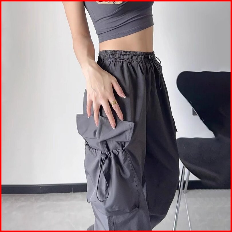 Celana Kargo Parasut Serut Wanita Oversize Kain Tebal Wide Leg Harajuku Streetwear Cargo Pants Kain Premium Highwaist Lo