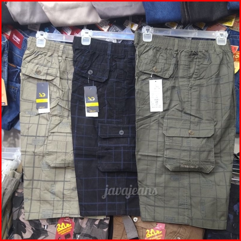 Celana Pendek 7 8 Katun Wash Import Motif Kotak-kotak Pinggang Karet Cargo