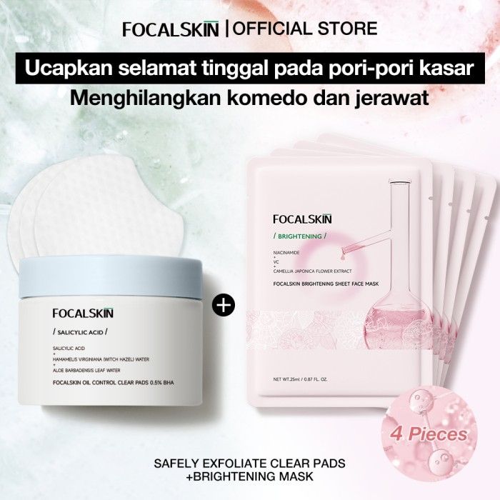 PAKET PERAWATAN WAJAH FOCALSKIN Paket Combo Safely Exfoliate Clearpads 60 Pad & Brightening Mask / Hydrating Mask