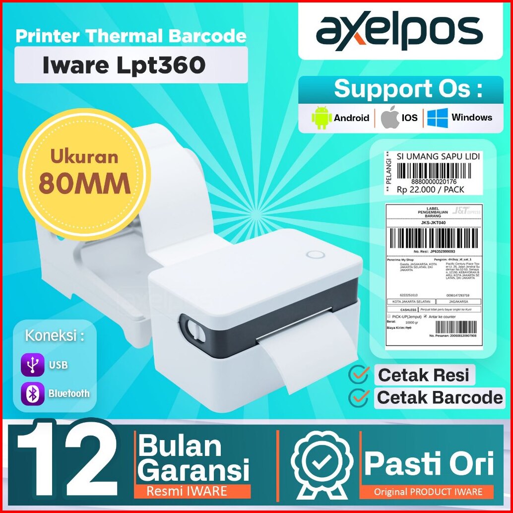 Axelpos Printer Barcode Thermal Label Stiker Resi Iware Lp-t360 Usb Bluetooth