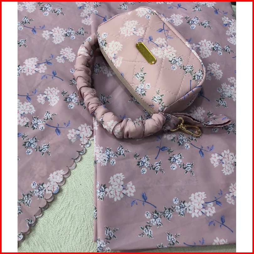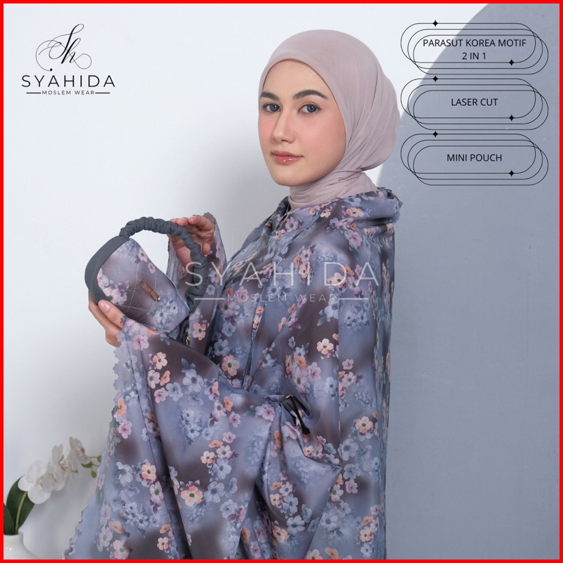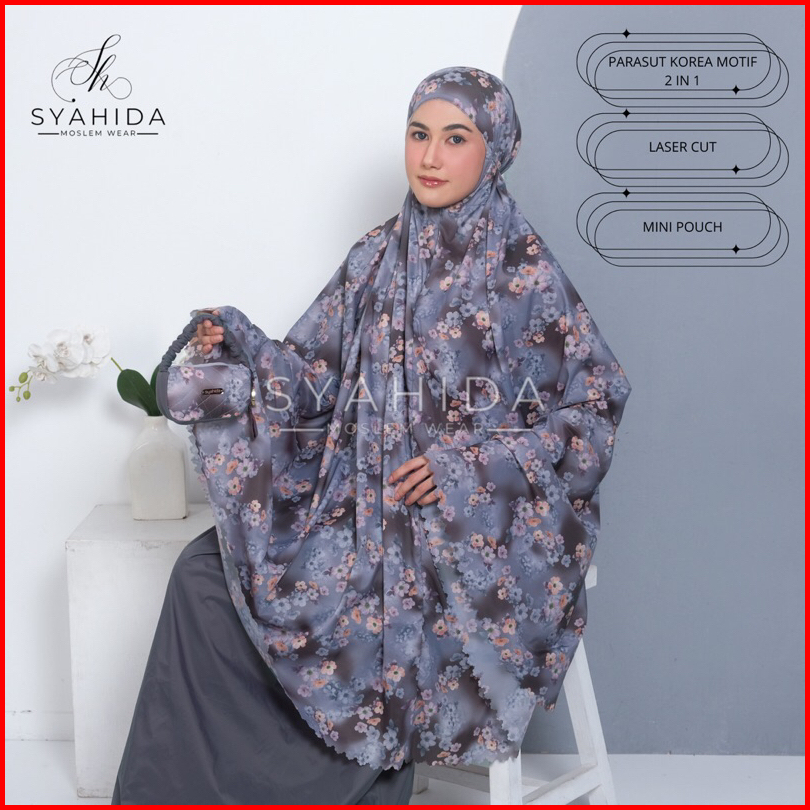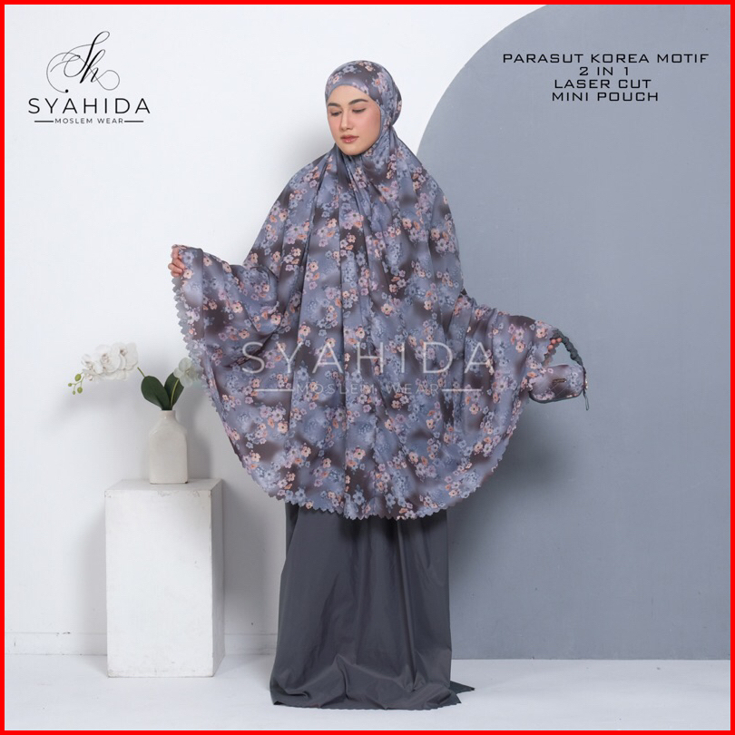 Mukena Dewasa Travel Mini Parasut Korea Motif Sarah Premium 2in1 Laser Cut Atasan Motif Bawahan Polos