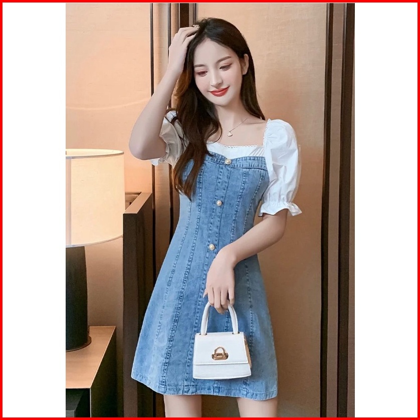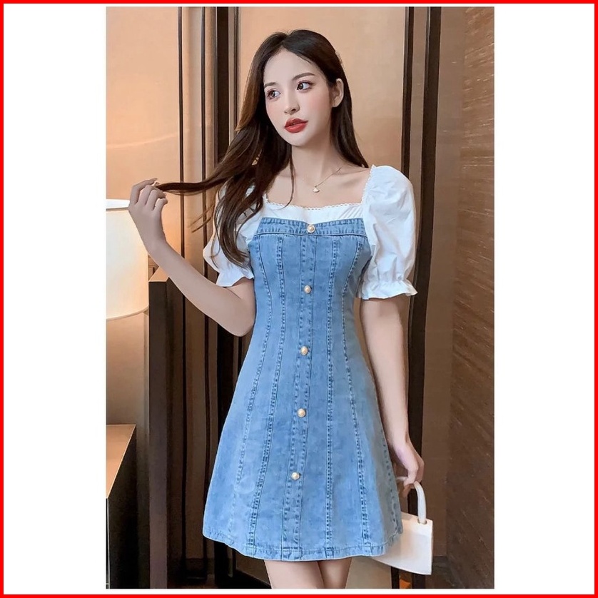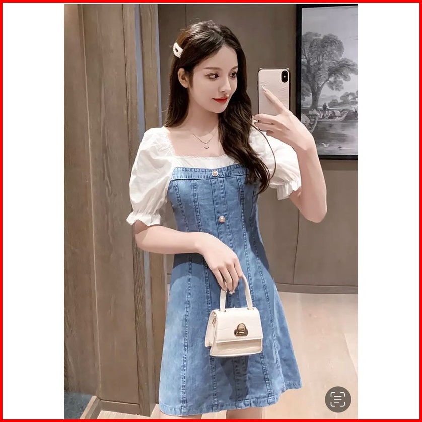 946- Dress Jeans Wanita Lengan Pendek Kombinasi Katun Strecth