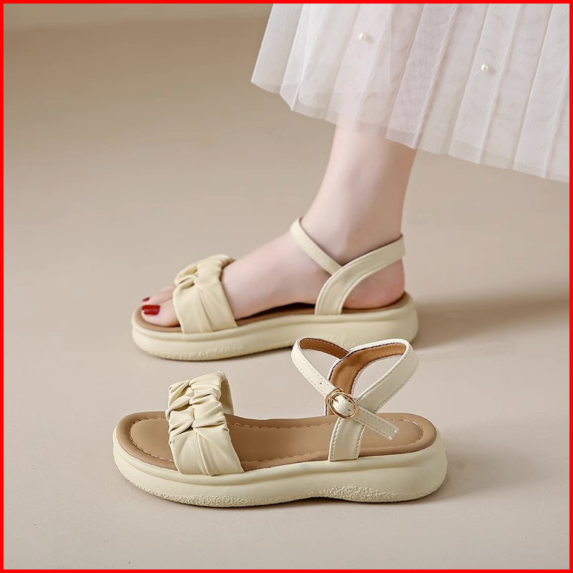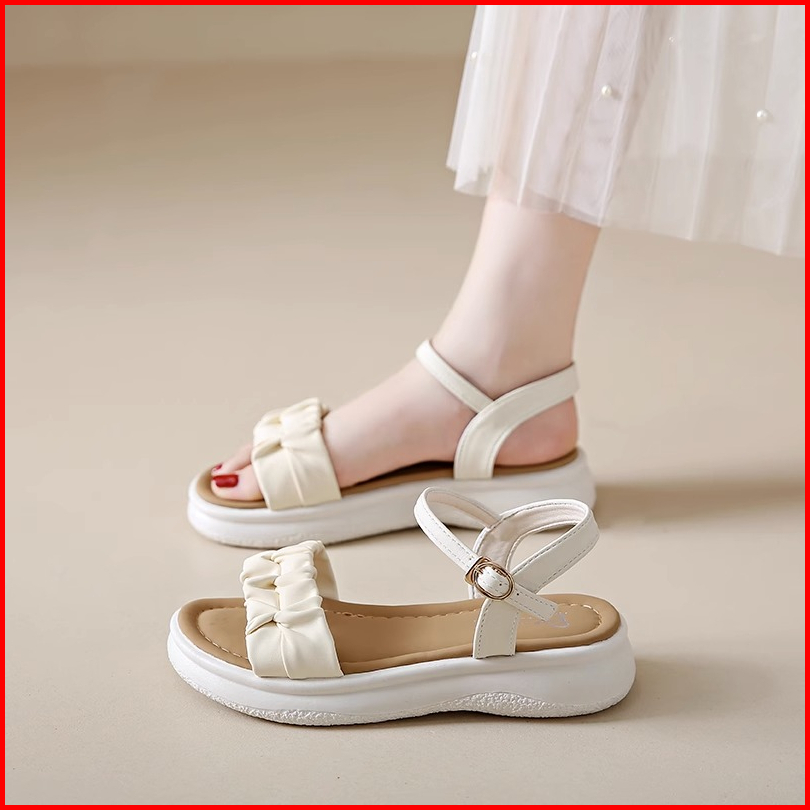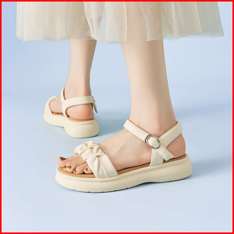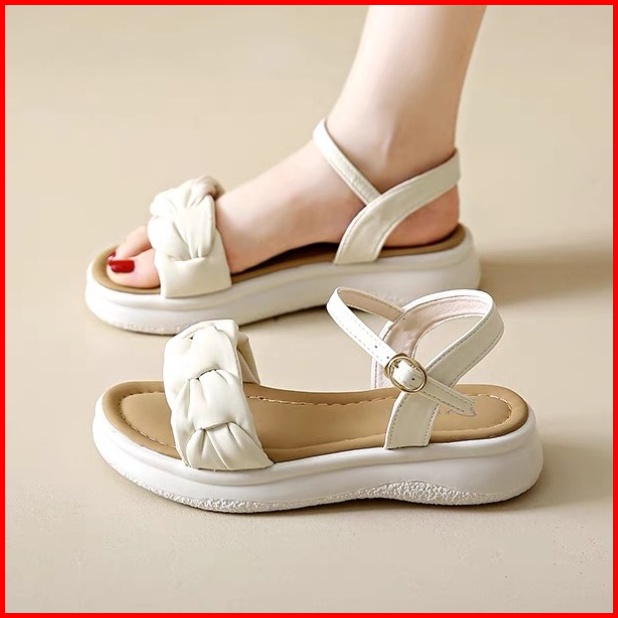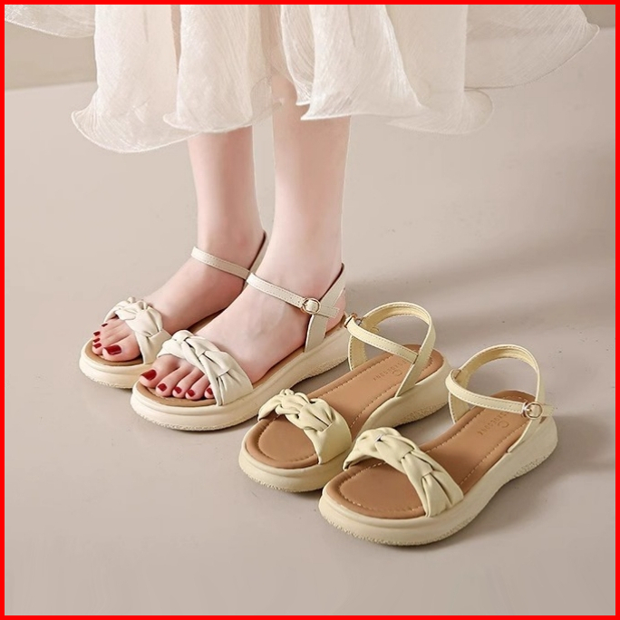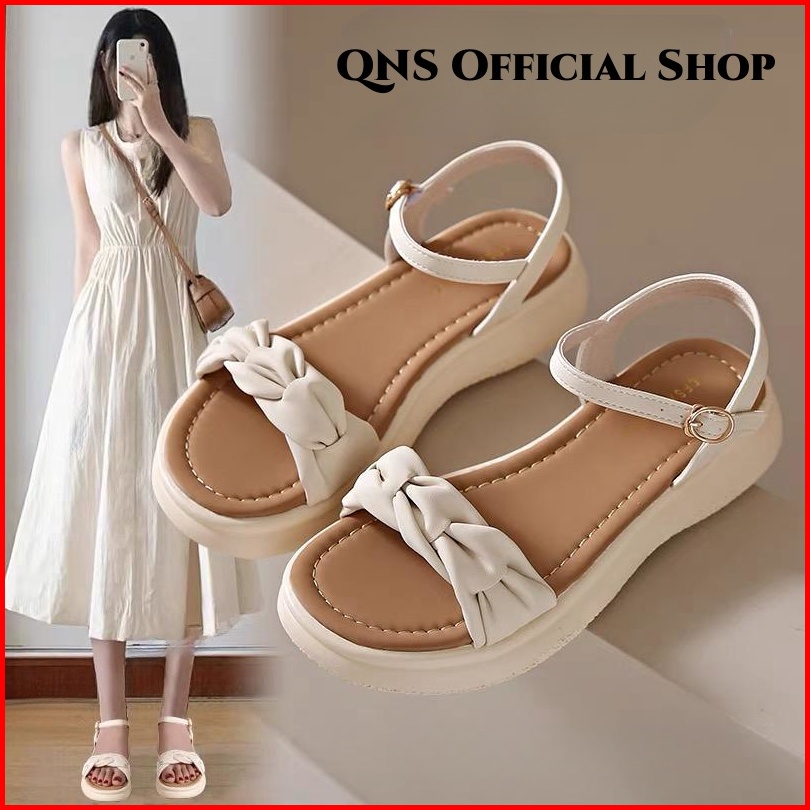Qns Sepatu Sandal Wanita Kekinian Cream Putih Sandal Wedges Spons Slip-on Sepatu Wanita Premium Quality Women Fashion Sh