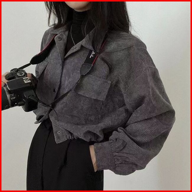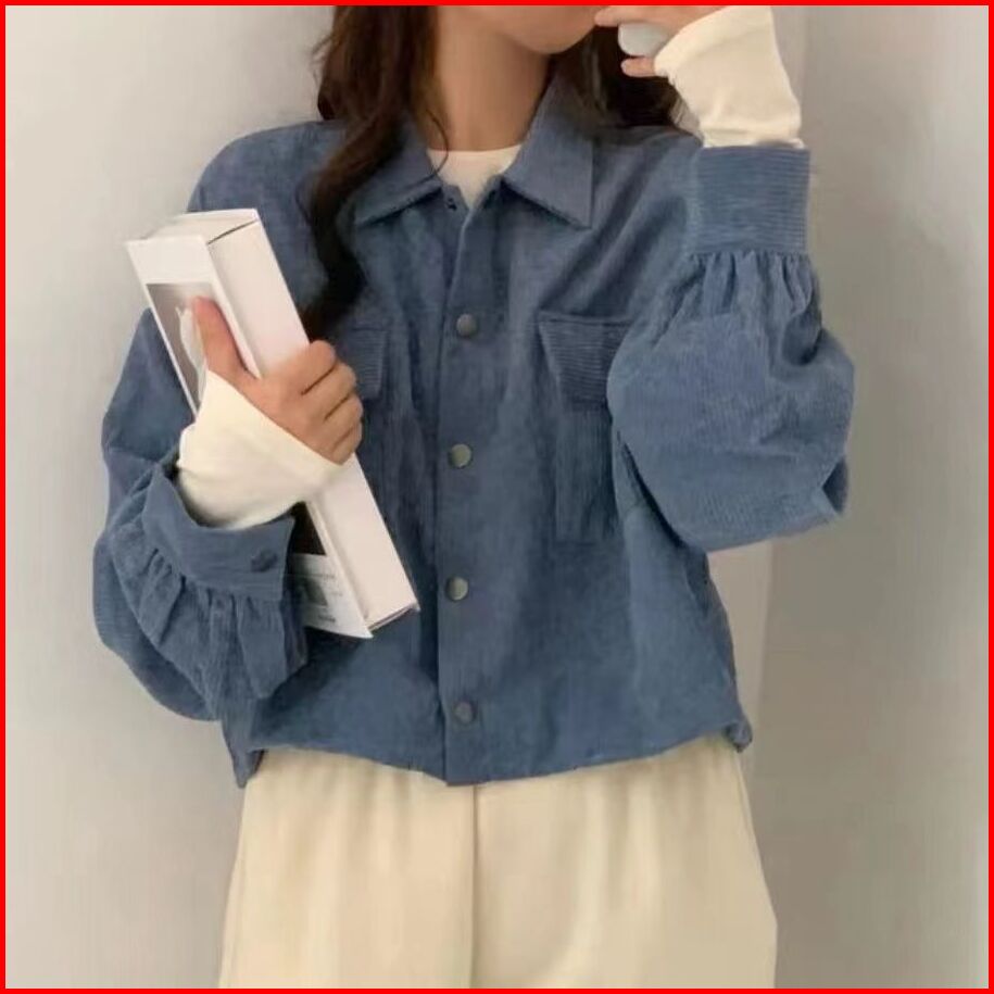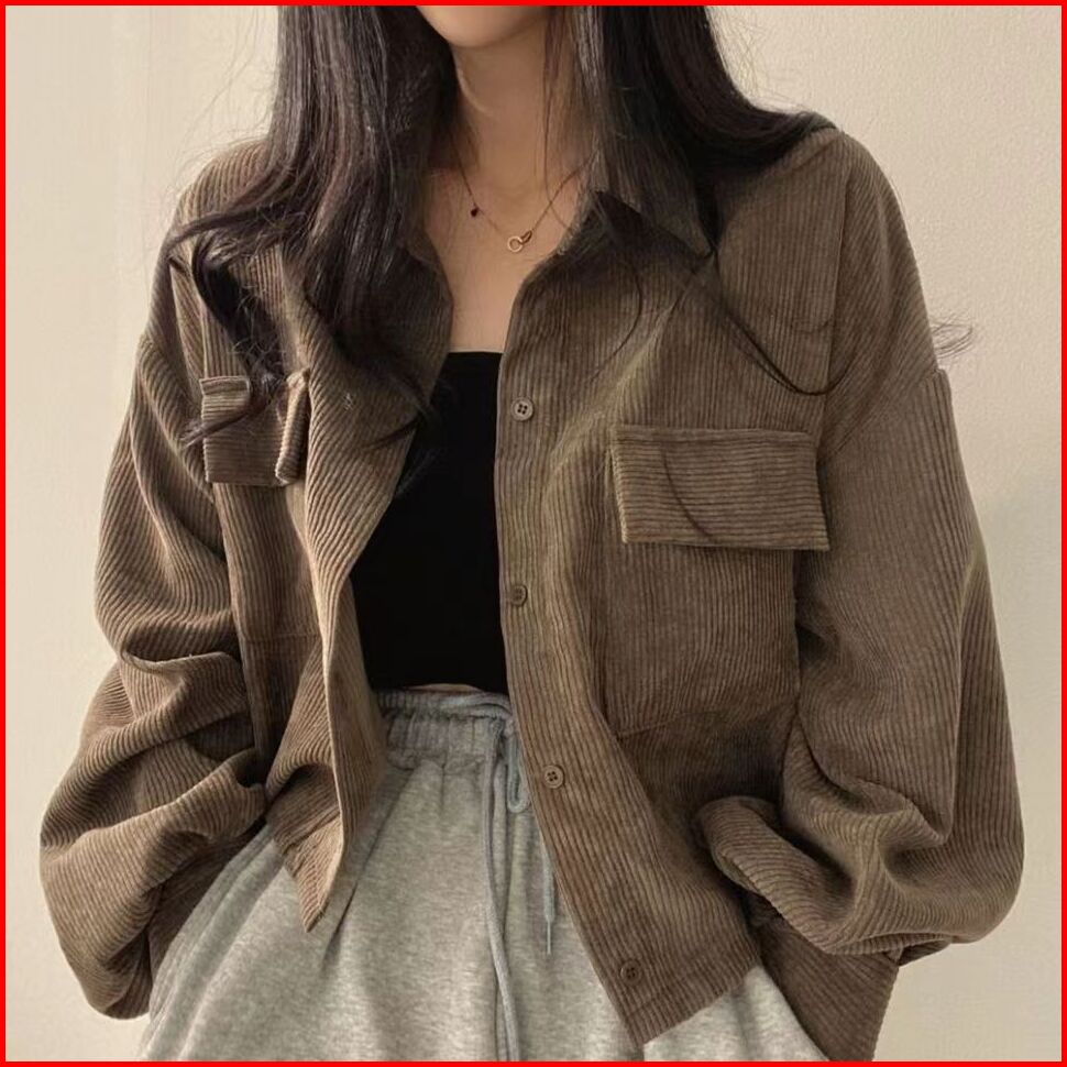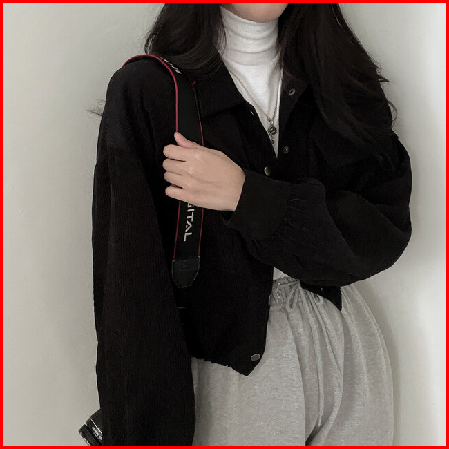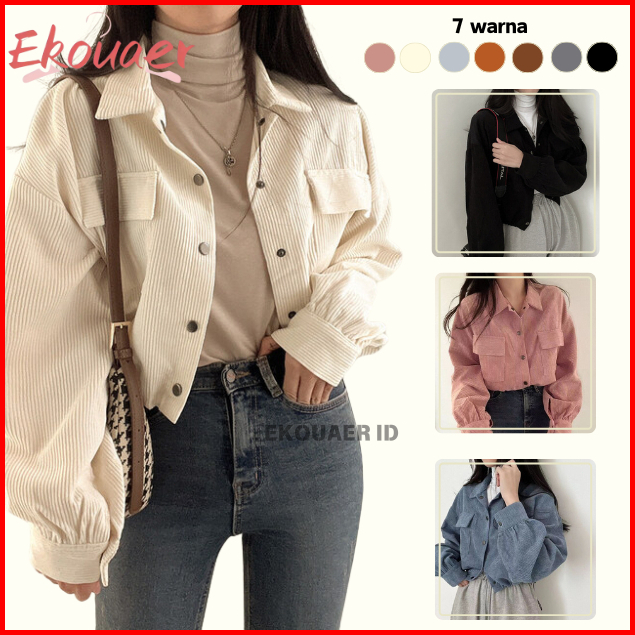 Ekouaer Retro Kolor Terbaru Jacket Crop Top Korean Style Corduroy Jaket Wanita Krem Hitam Pink