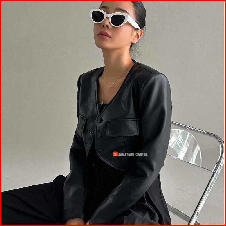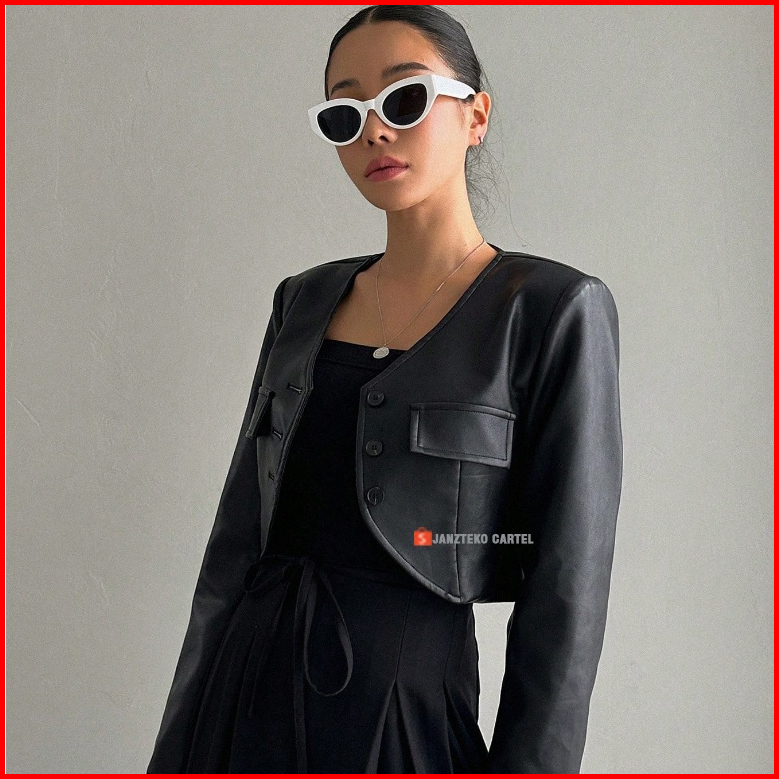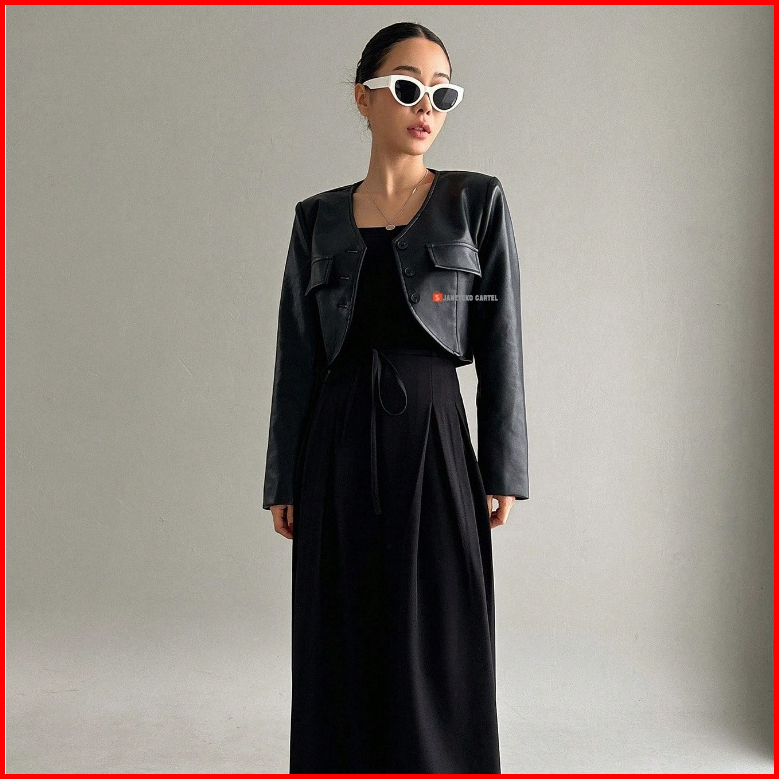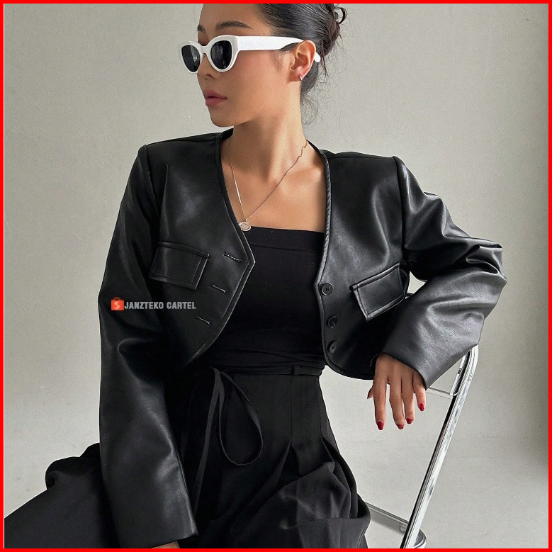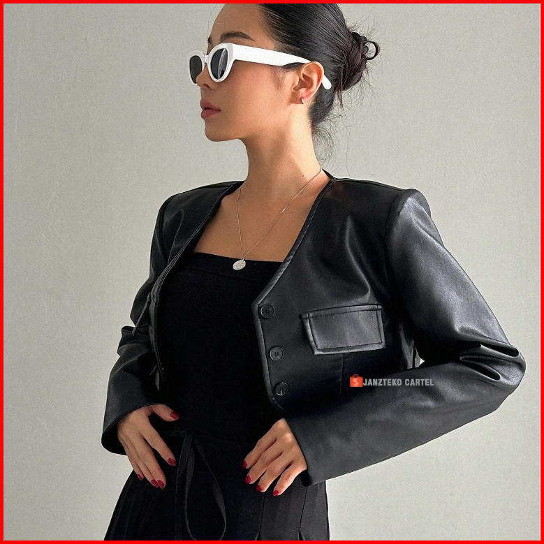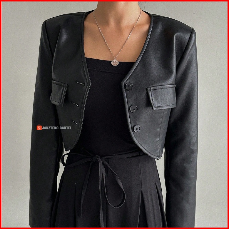 Jnk X Elena - Jaket Blazer Crop Top Casual Wanita Kulit Sintetis Viena Kancing Double Pocket Leather Jacket Black Premiu