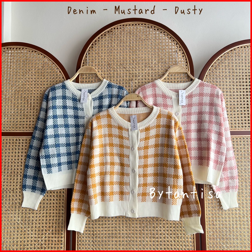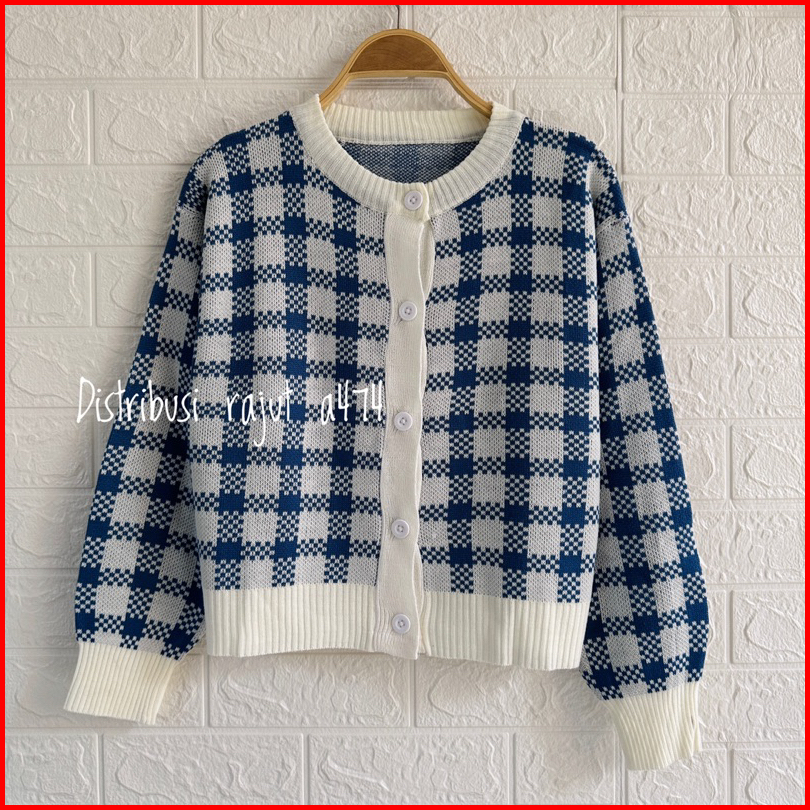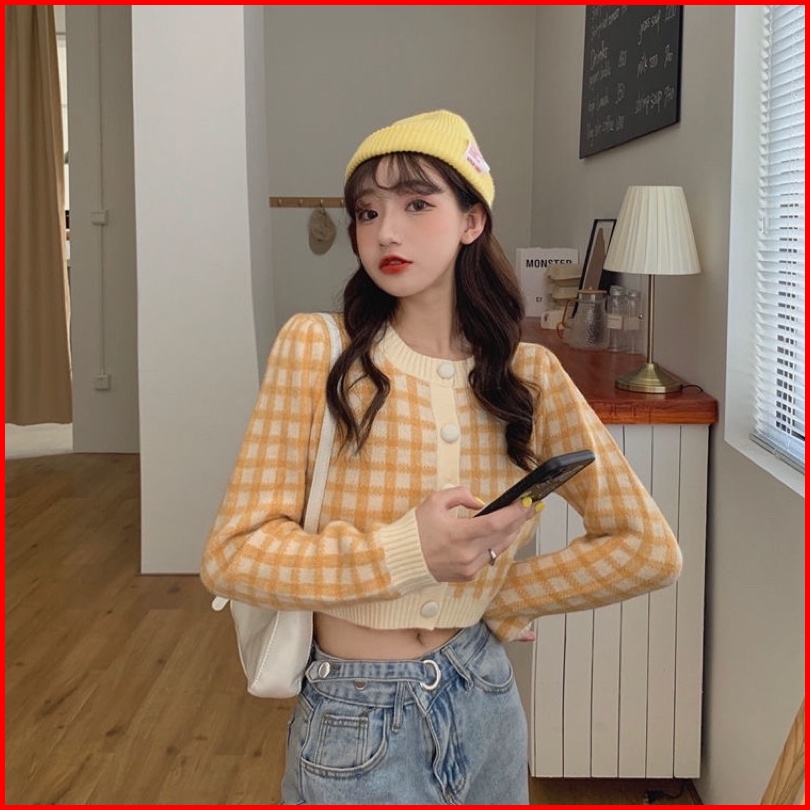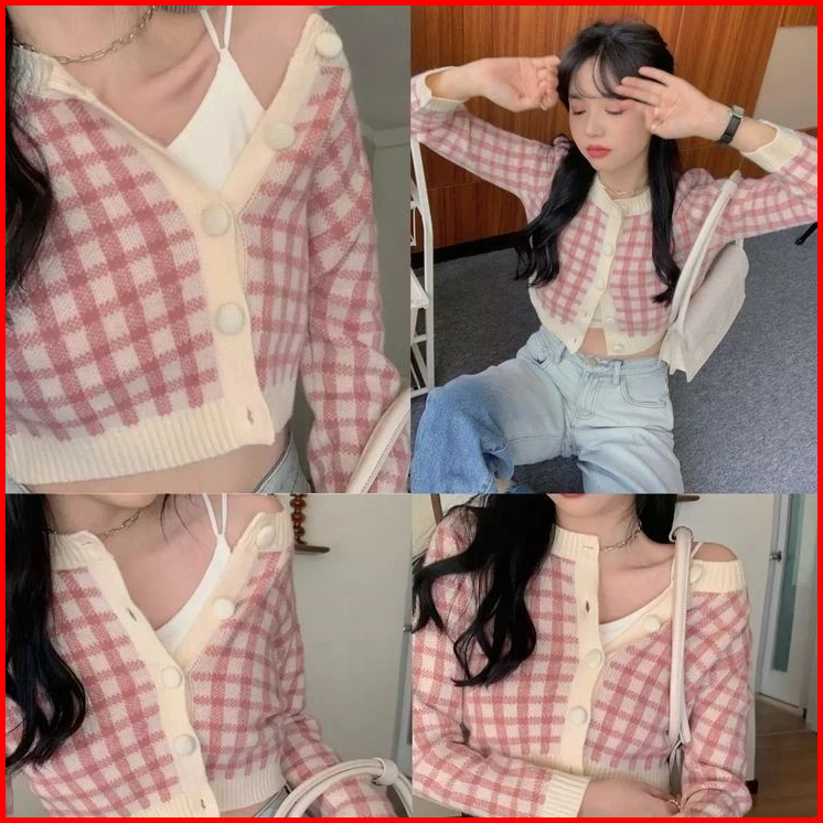 Snow Crop Top Cardi Korean Rajut Sweater Cardigan Motif Kotak Kotak Cardigan Crop Top Knit Korean Style Rajut Lengan Pan