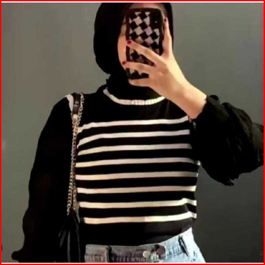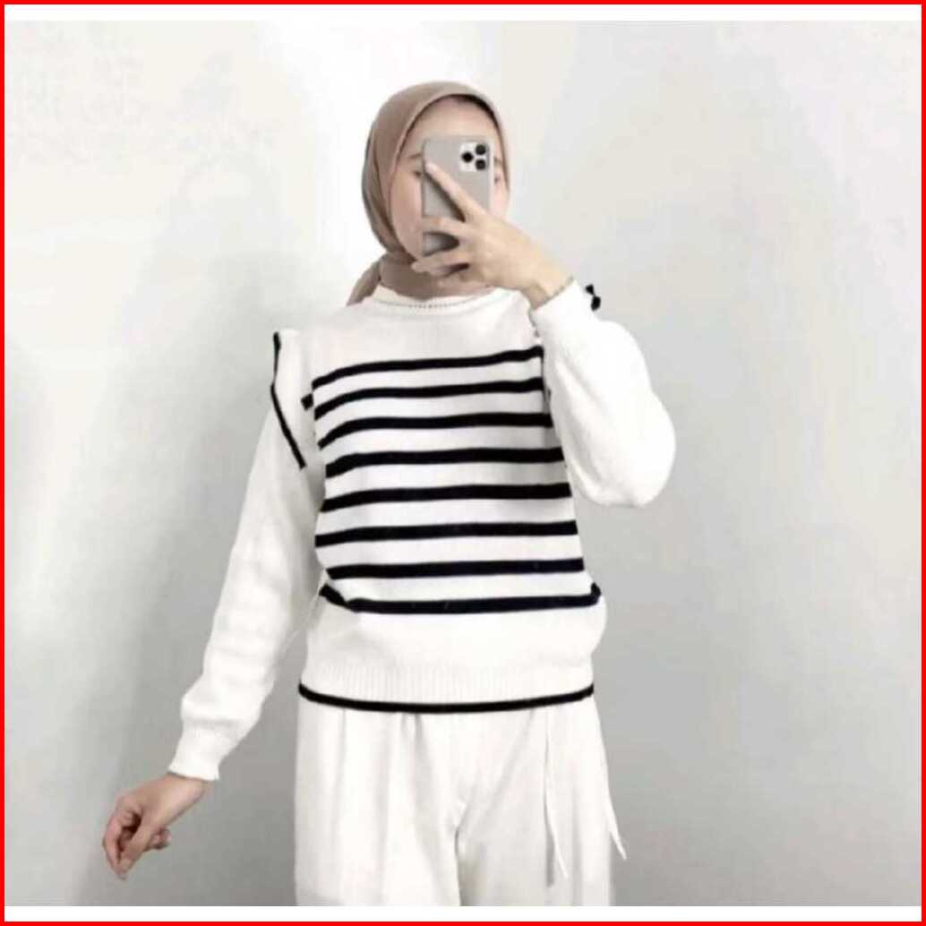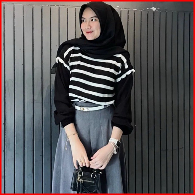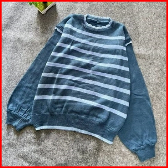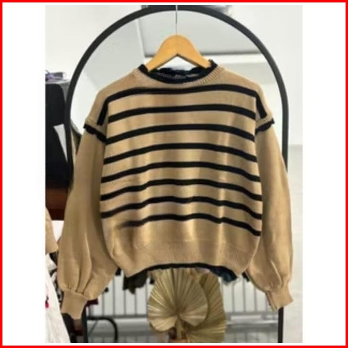 Atasan Sweater Rajut Wanita Lengan Balon Lengan Panjang Basic Korean Garis Knit Tops Oversize