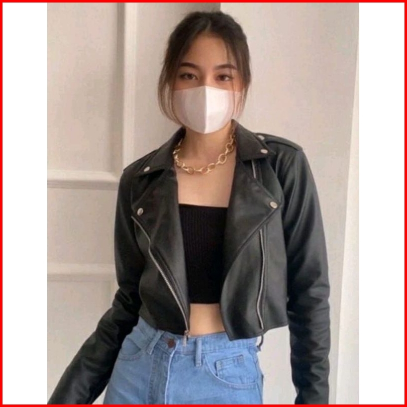 Jaket Kulit Sintetis Wanita Hitam Crop S-xxl