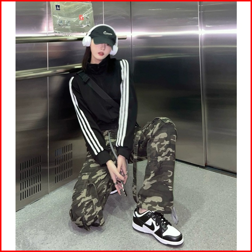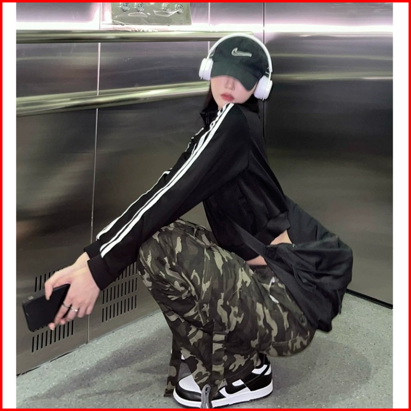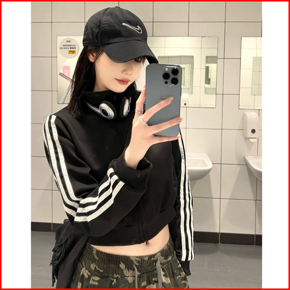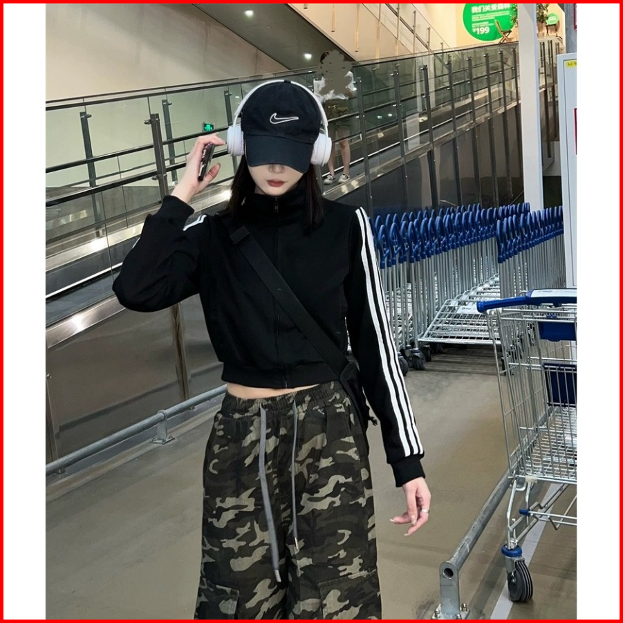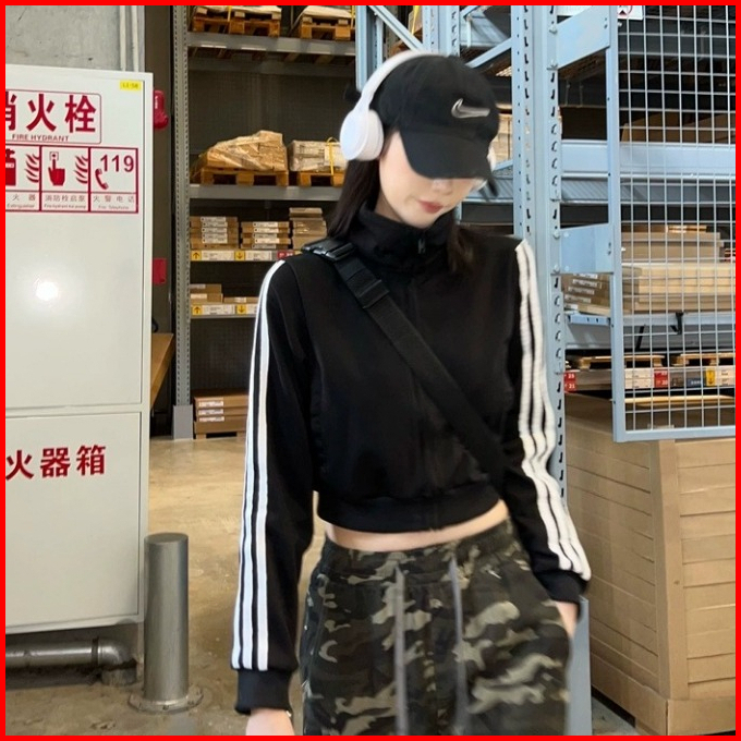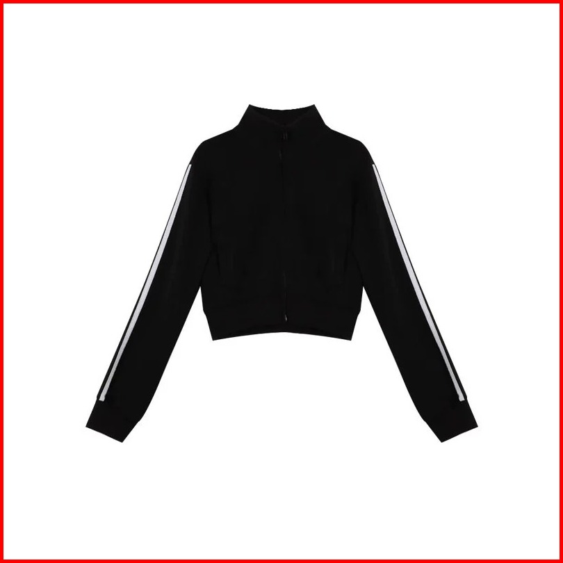 Stripe Jaket Zipper Sweater Crop Wanita Hitam Terbaru Korean Style Jacket